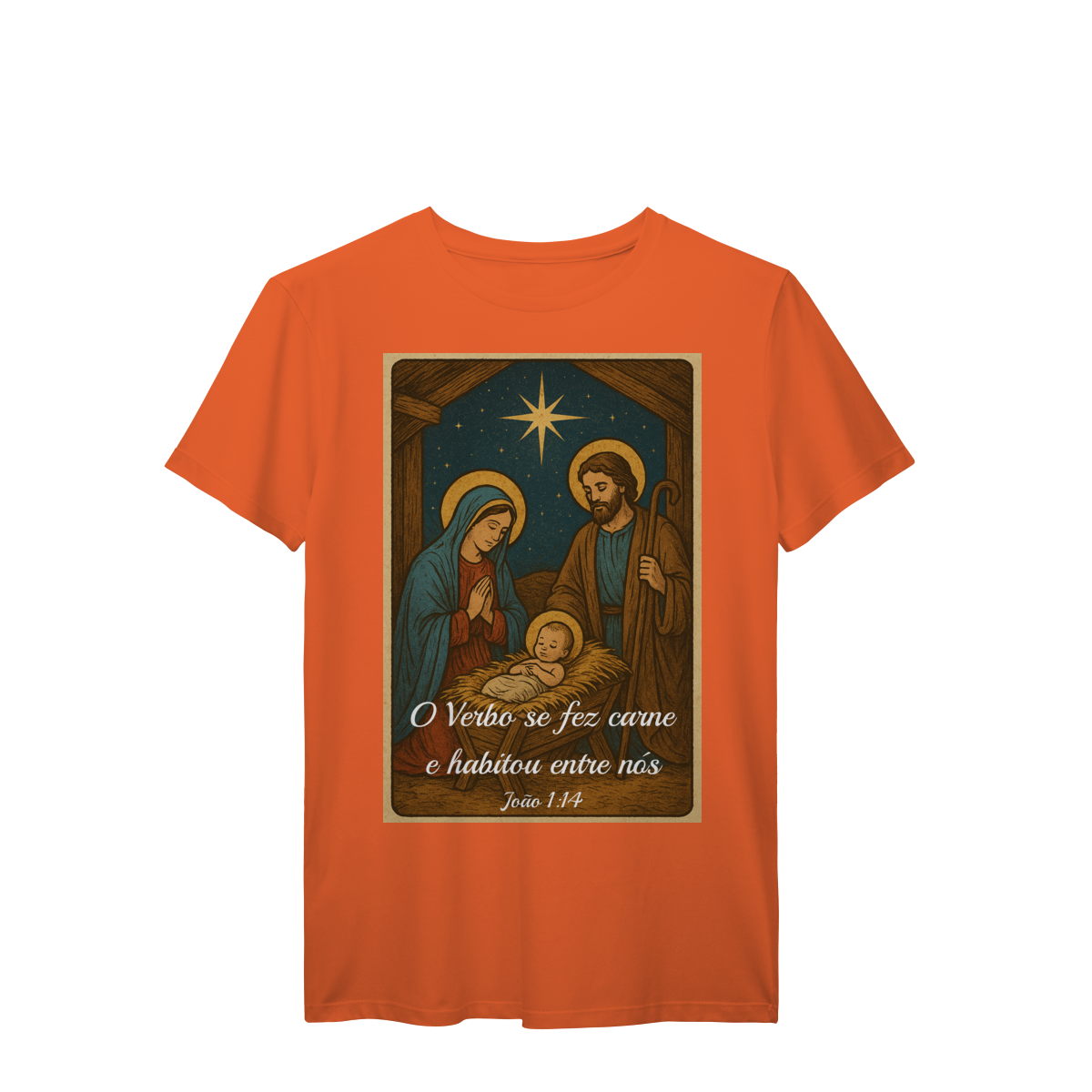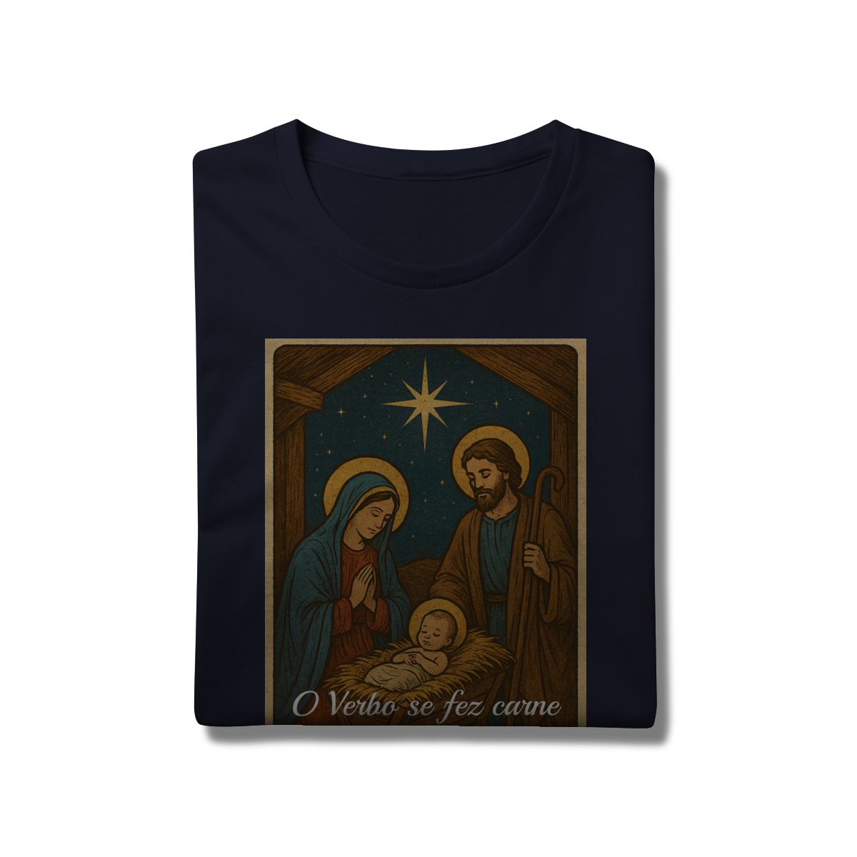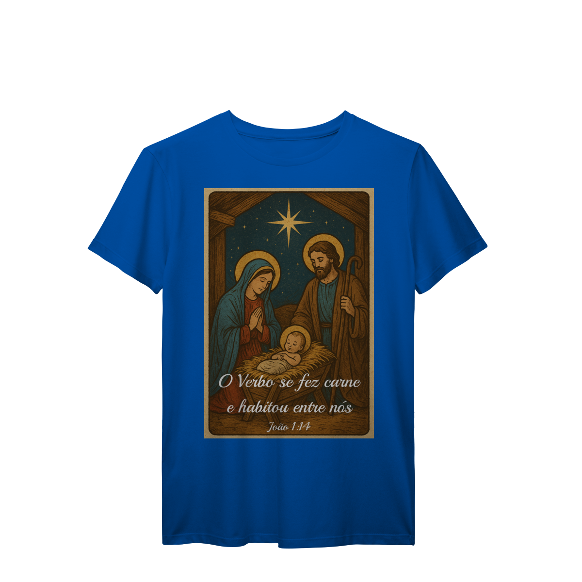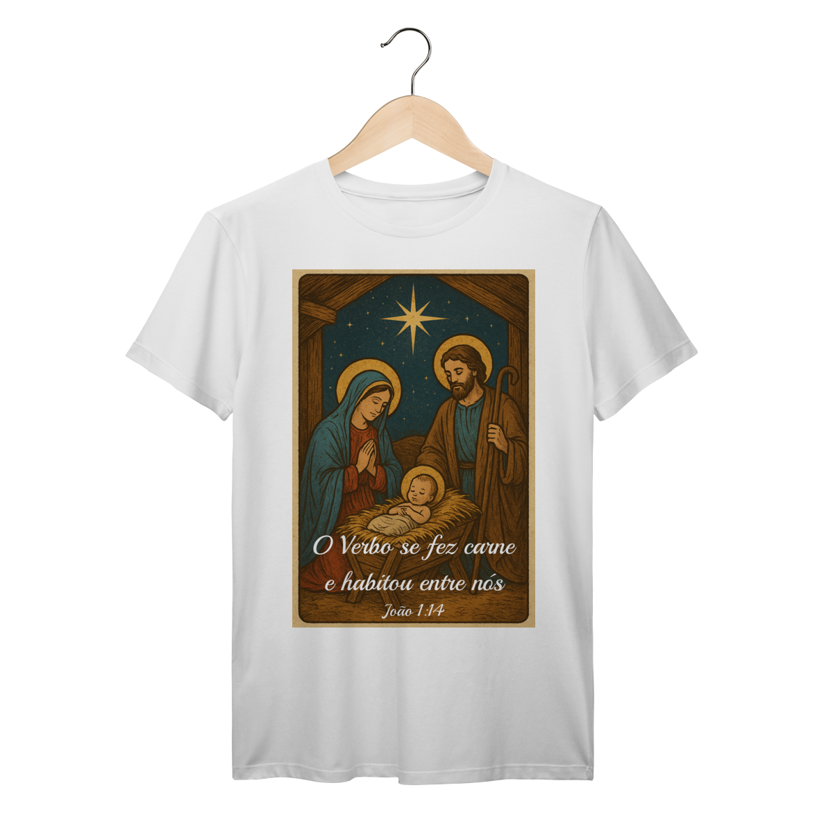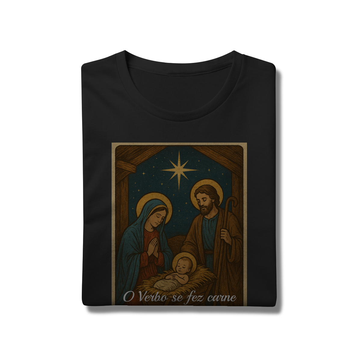 A T-Shirt Prime “O Verbo Se Fez Carne” combina qualidade superior com uma arte sacra cheia de profundidade. A estampa apresenta a cena clássica do presépio — Maria, José e o Menino Jesus sob a luz da Estrela de Belém — acompanhada da passagem bíblica “O Verbo se fez carne e habitou entre nós — João 1:14”.