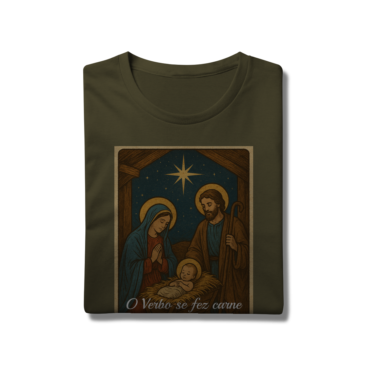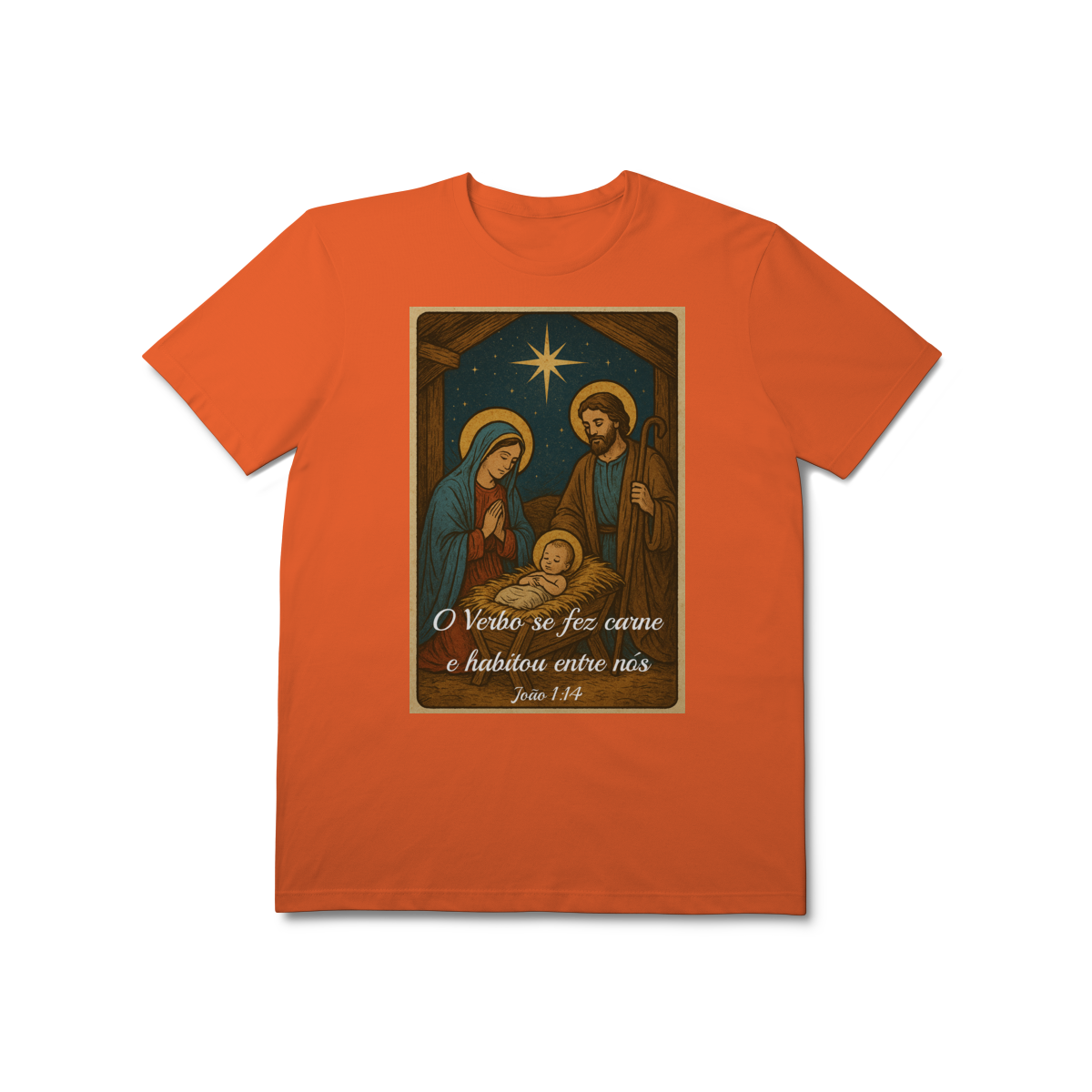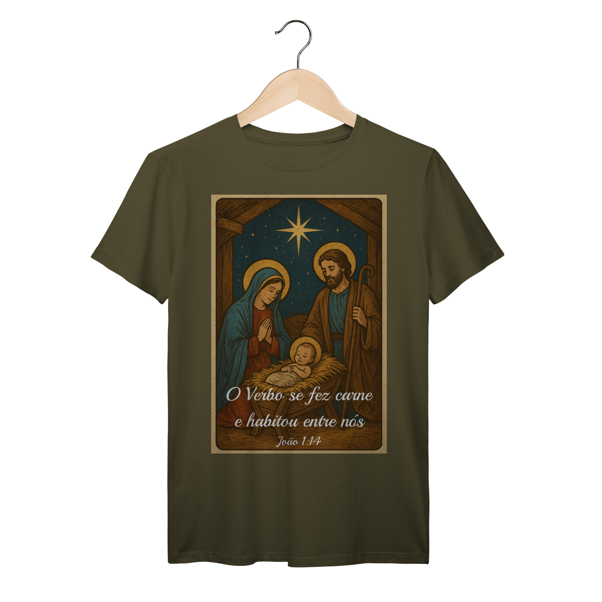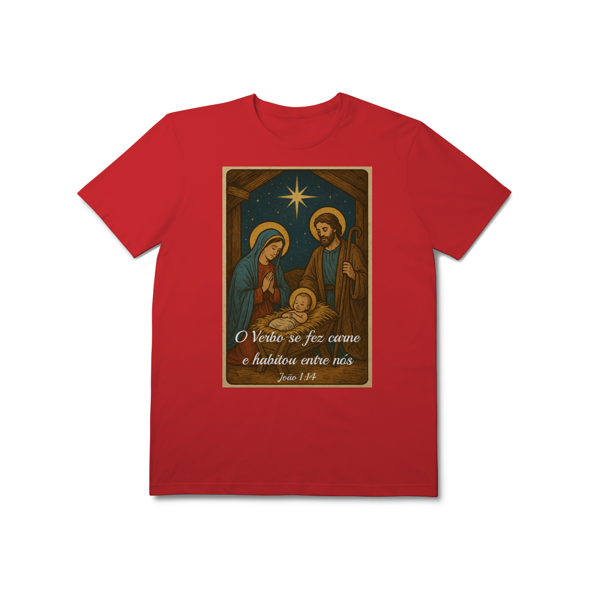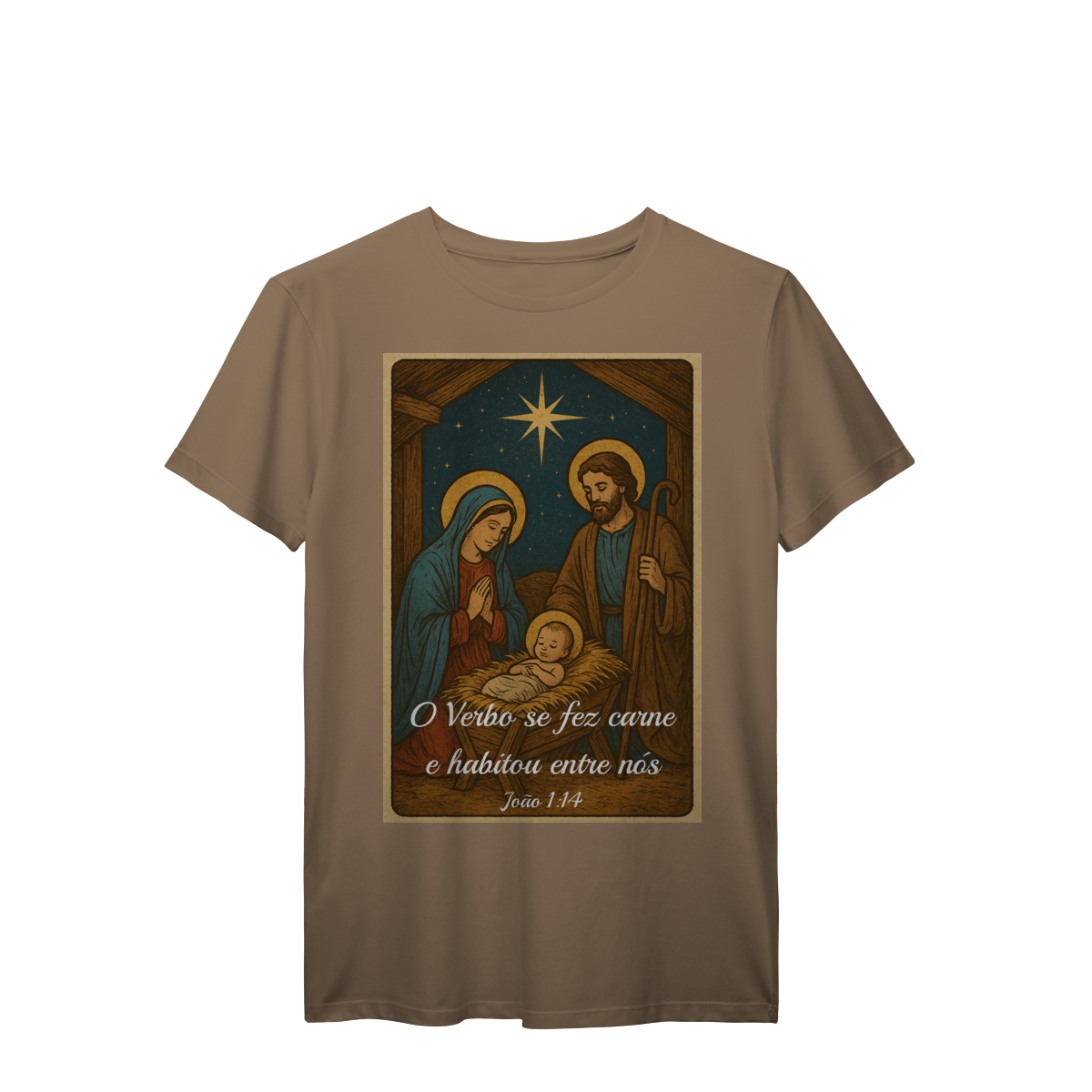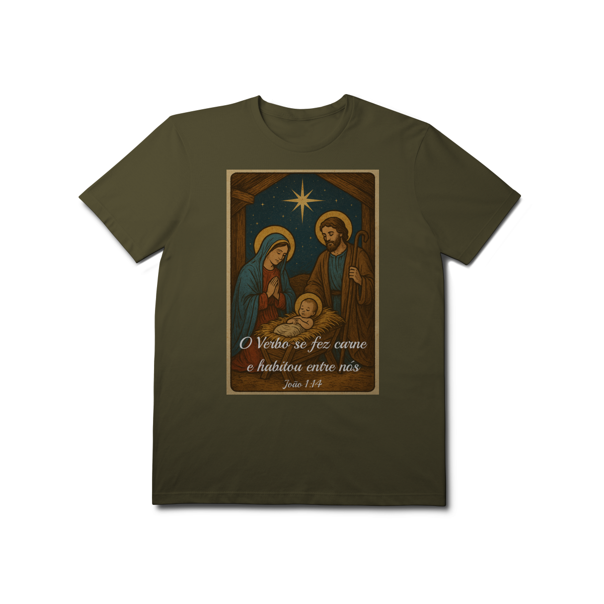 A T-Shirt Prime “O Verbo Se Fez Carne” combina qualidade superior com uma arte sacra cheia de profundidade. A estampa apresenta a cena clássica do presépio — Maria, José e o Menino Jesus sob a luz da Estrela de Belém — acompanhada da passagem bíblica “O Verbo se fez carne e habitou entre nós — João 1:14”.