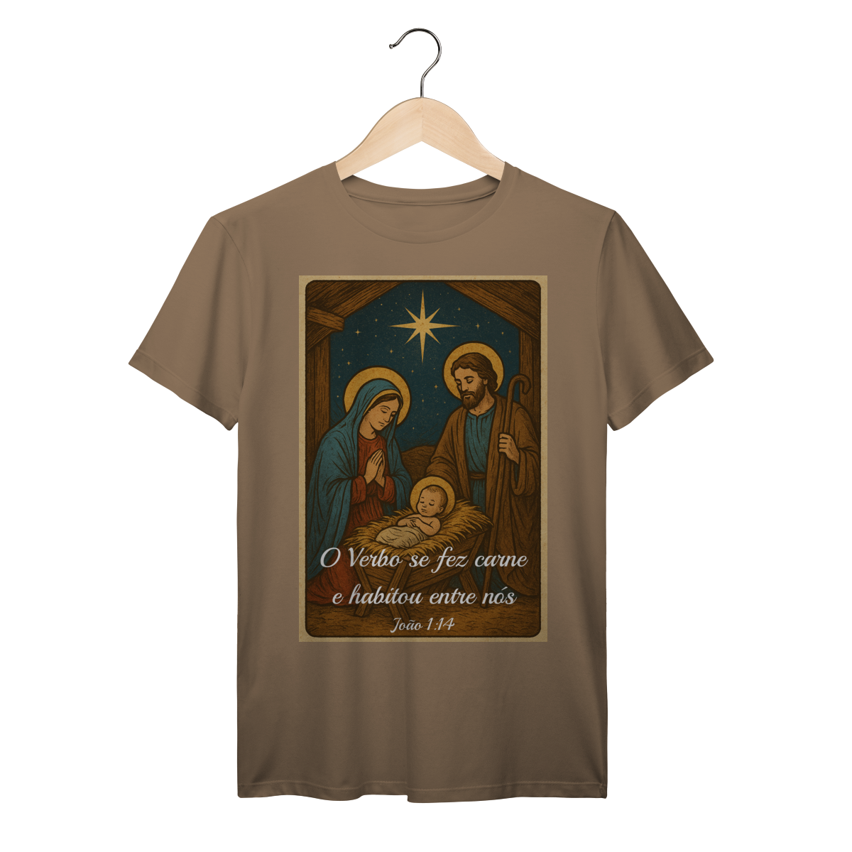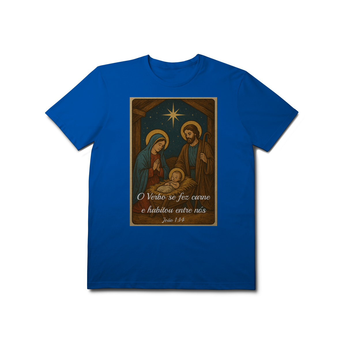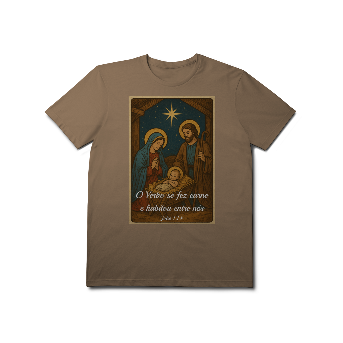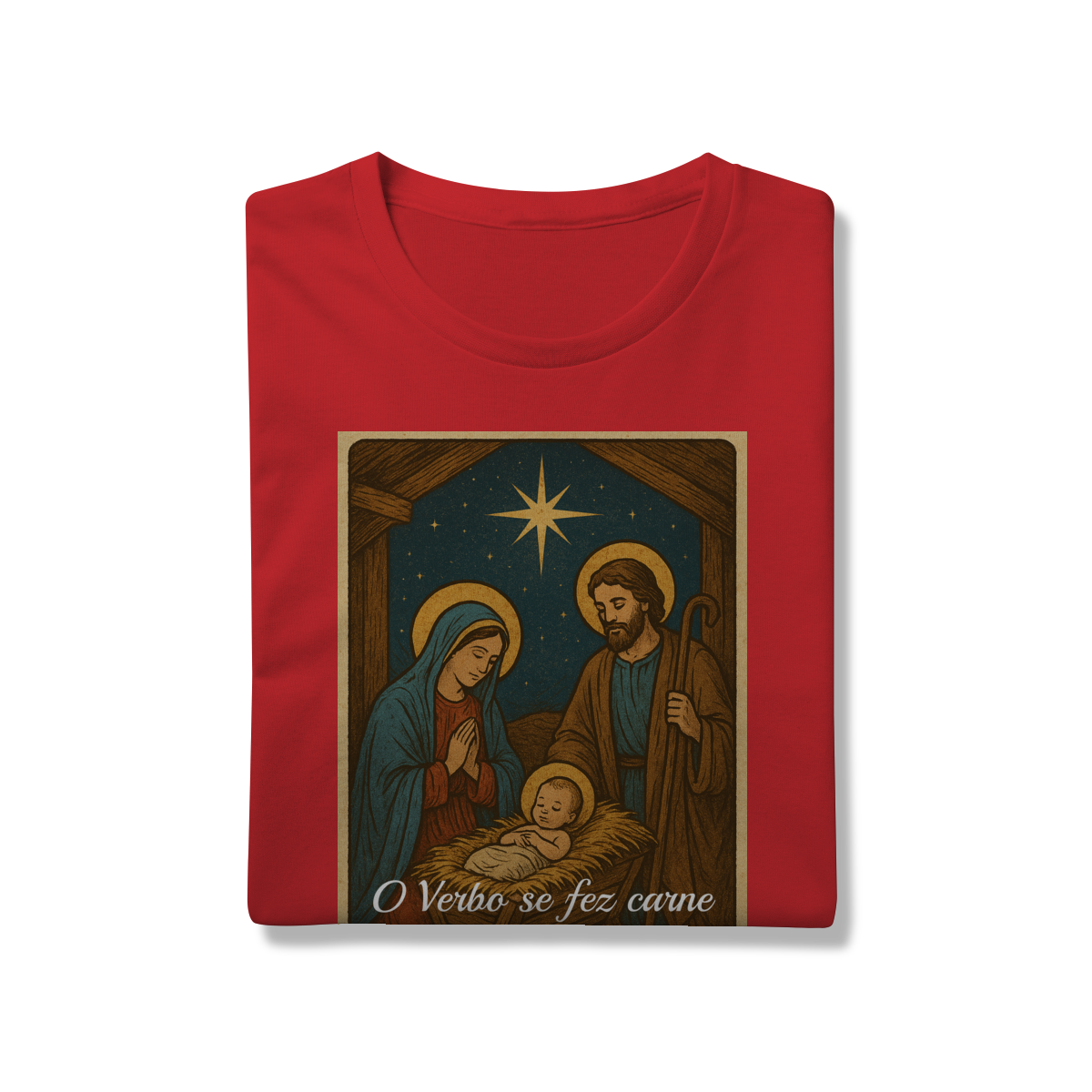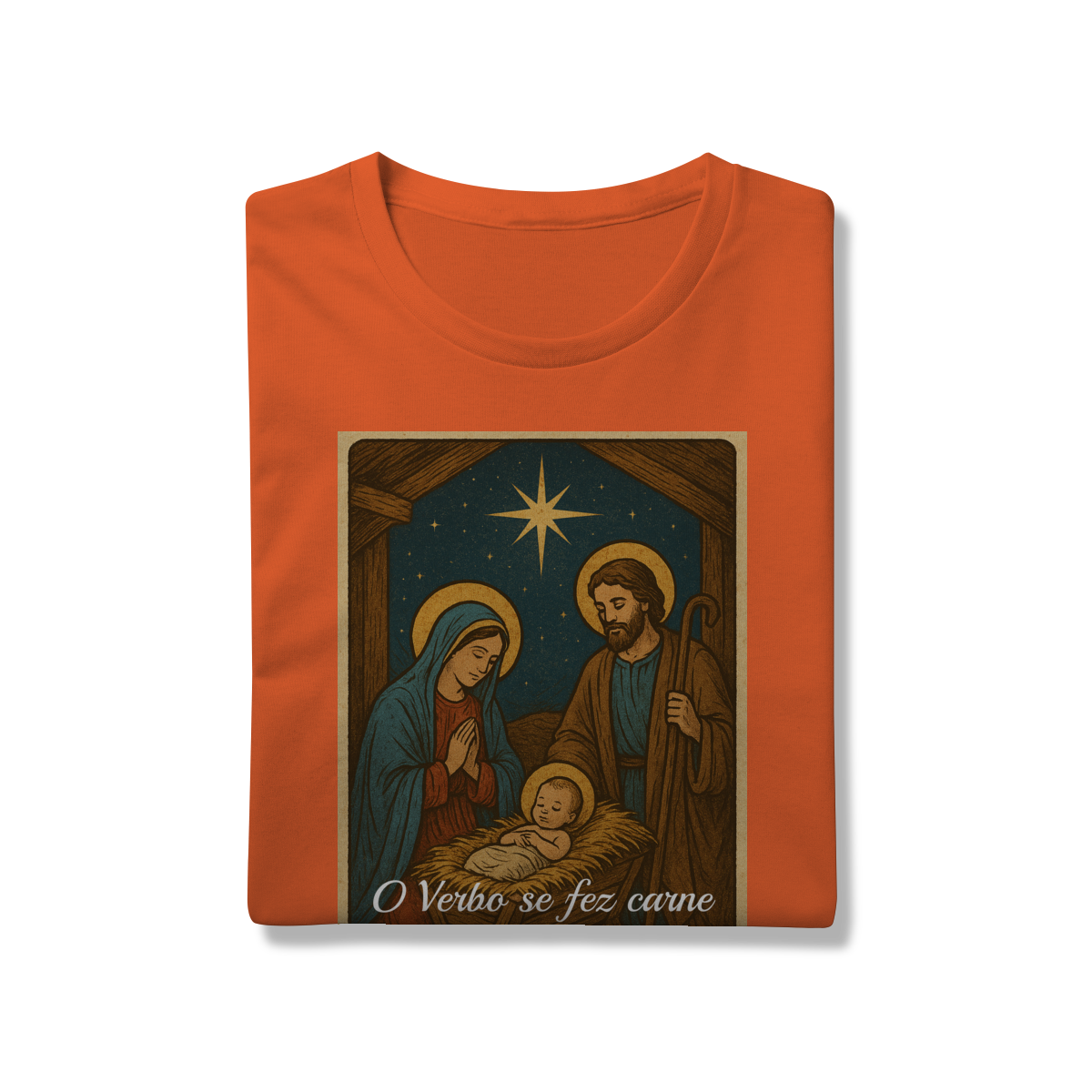 A T-Shirt Prime “O Verbo Se Fez Carne” combina qualidade superior com uma arte sacra cheia de profundidade. A estampa apresenta a cena clássica do presépio — Maria, José e o Menino Jesus sob a luz da Estrela de Belém — acompanhada da passagem bíblica “O Verbo se fez carne e habitou entre nós — João 1:14”.