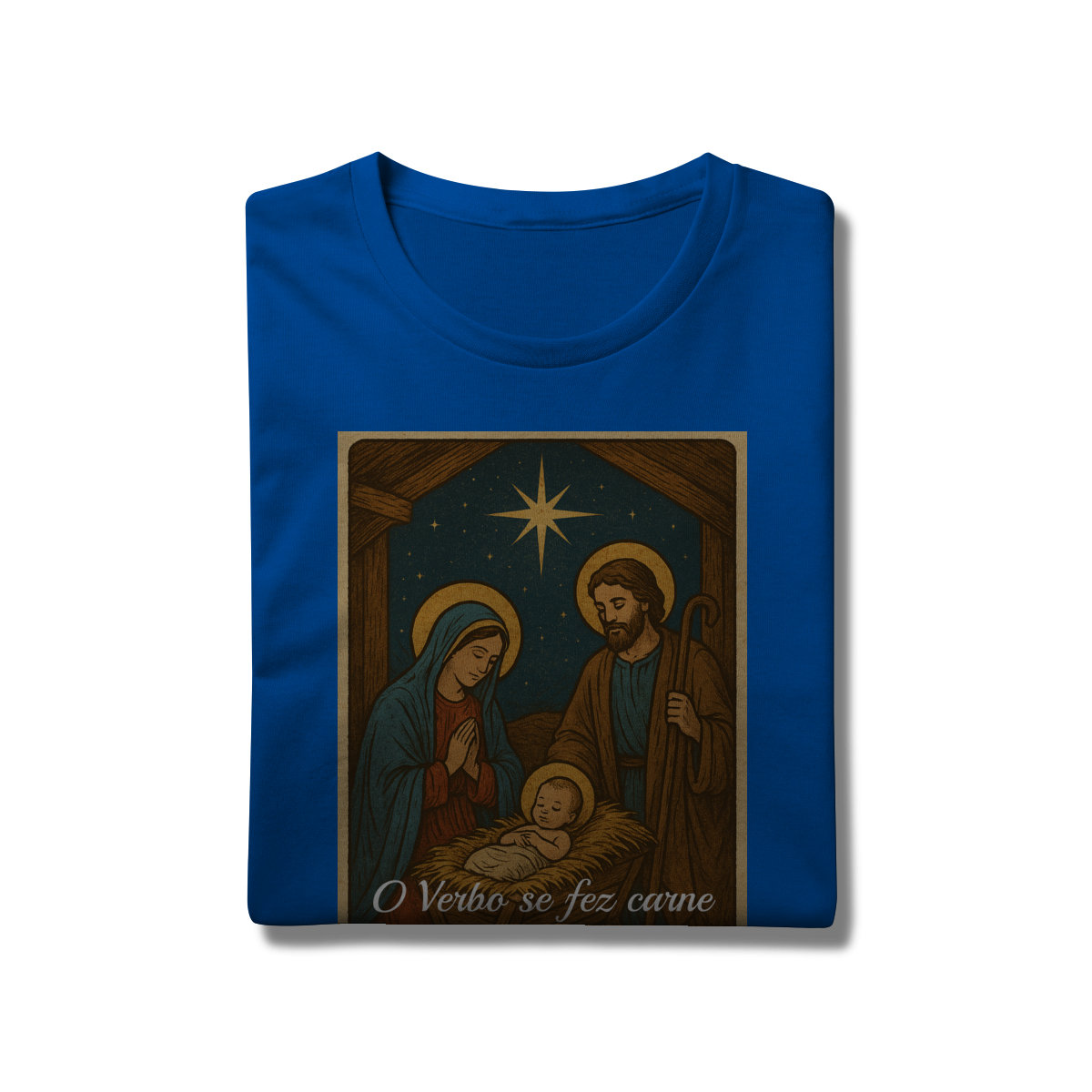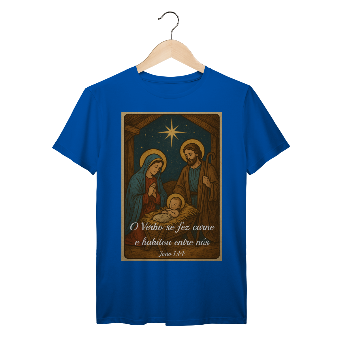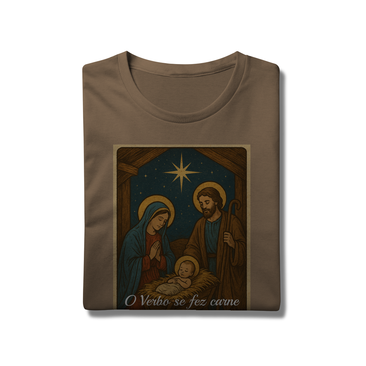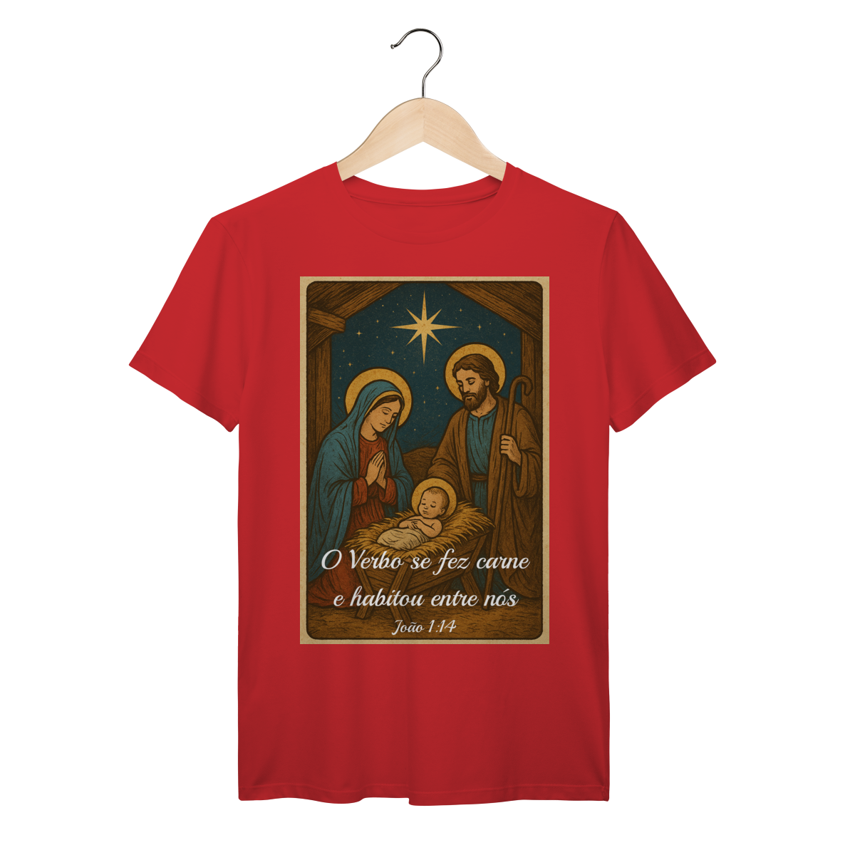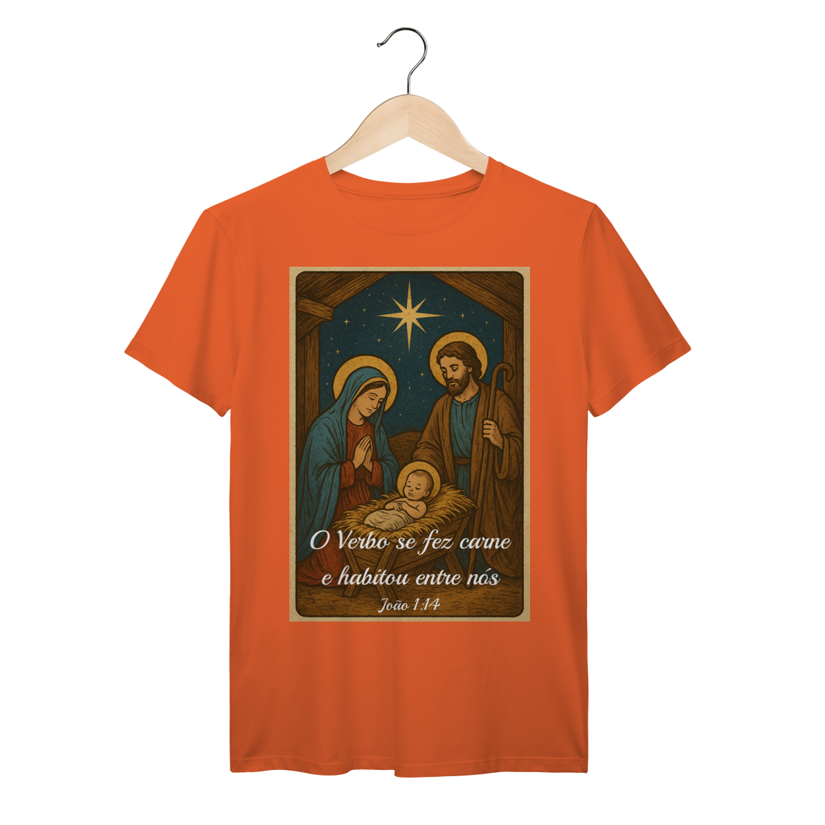 A T-Shirt Prime “O Verbo Se Fez Carne” combina qualidade superior com uma arte sacra cheia de profundidade. A estampa apresenta a cena clássica do presépio — Maria, José e o Menino Jesus sob a luz da Estrela de Belém — acompanhada da passagem bíblica “O Verbo se fez carne e habitou entre nós — João 1:14”.