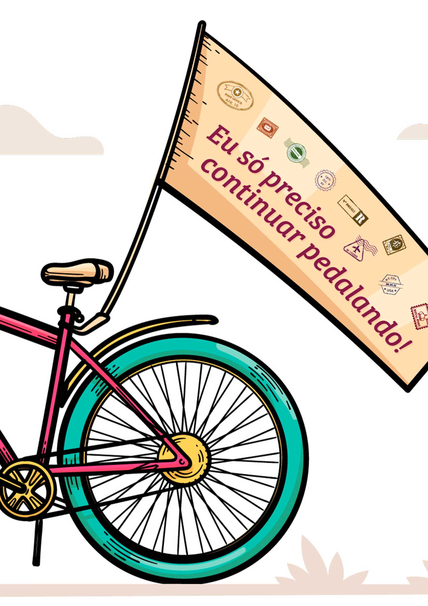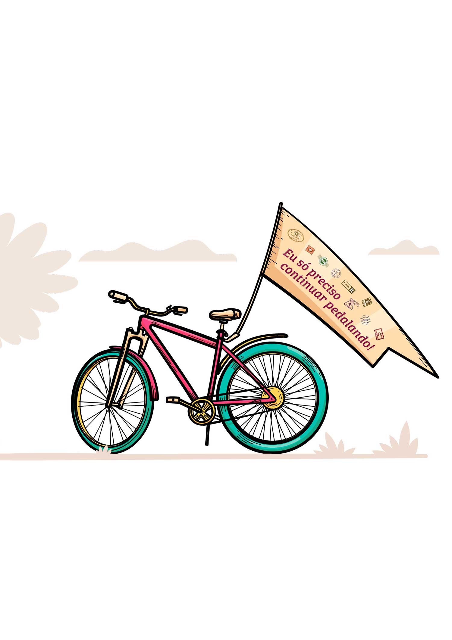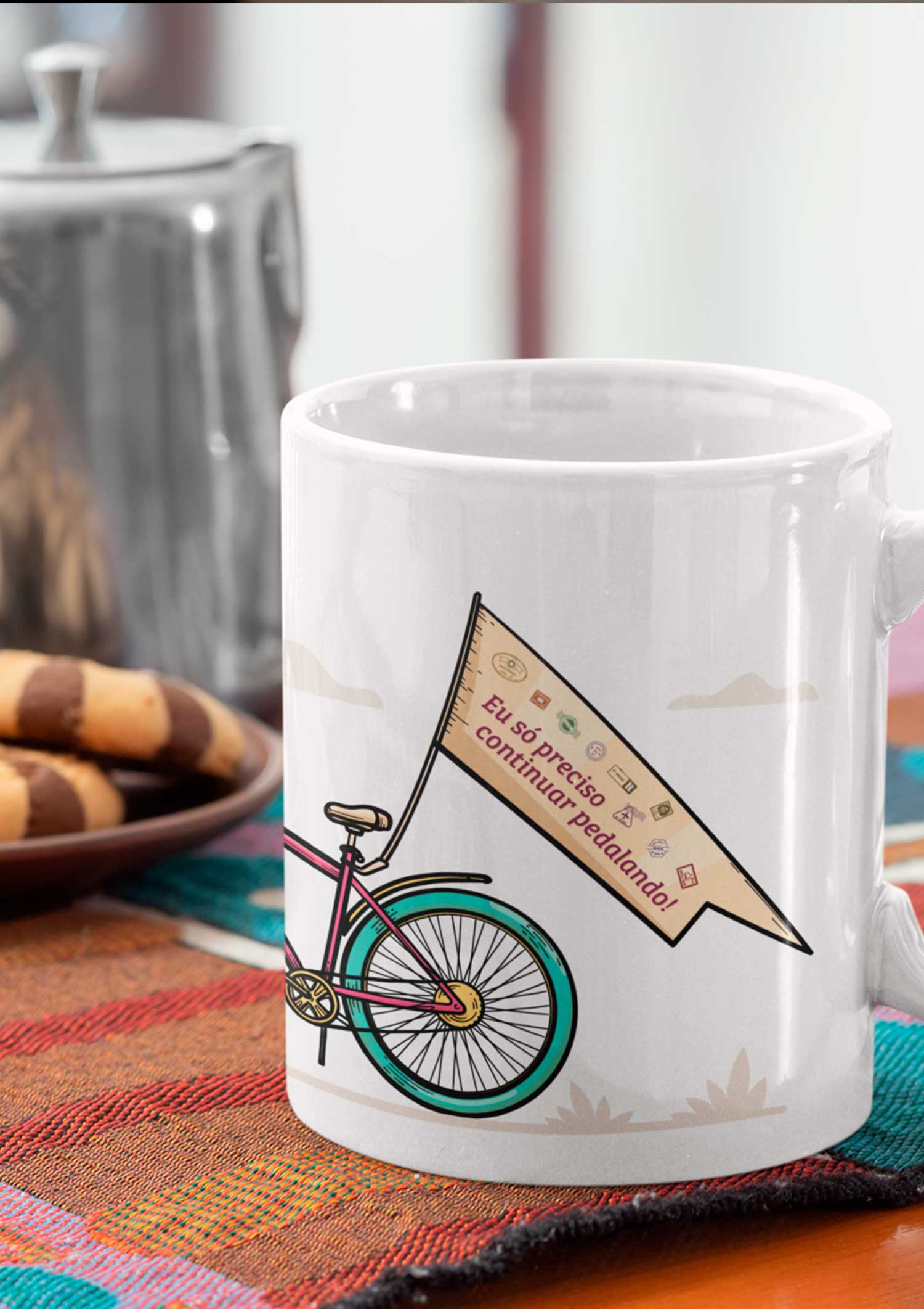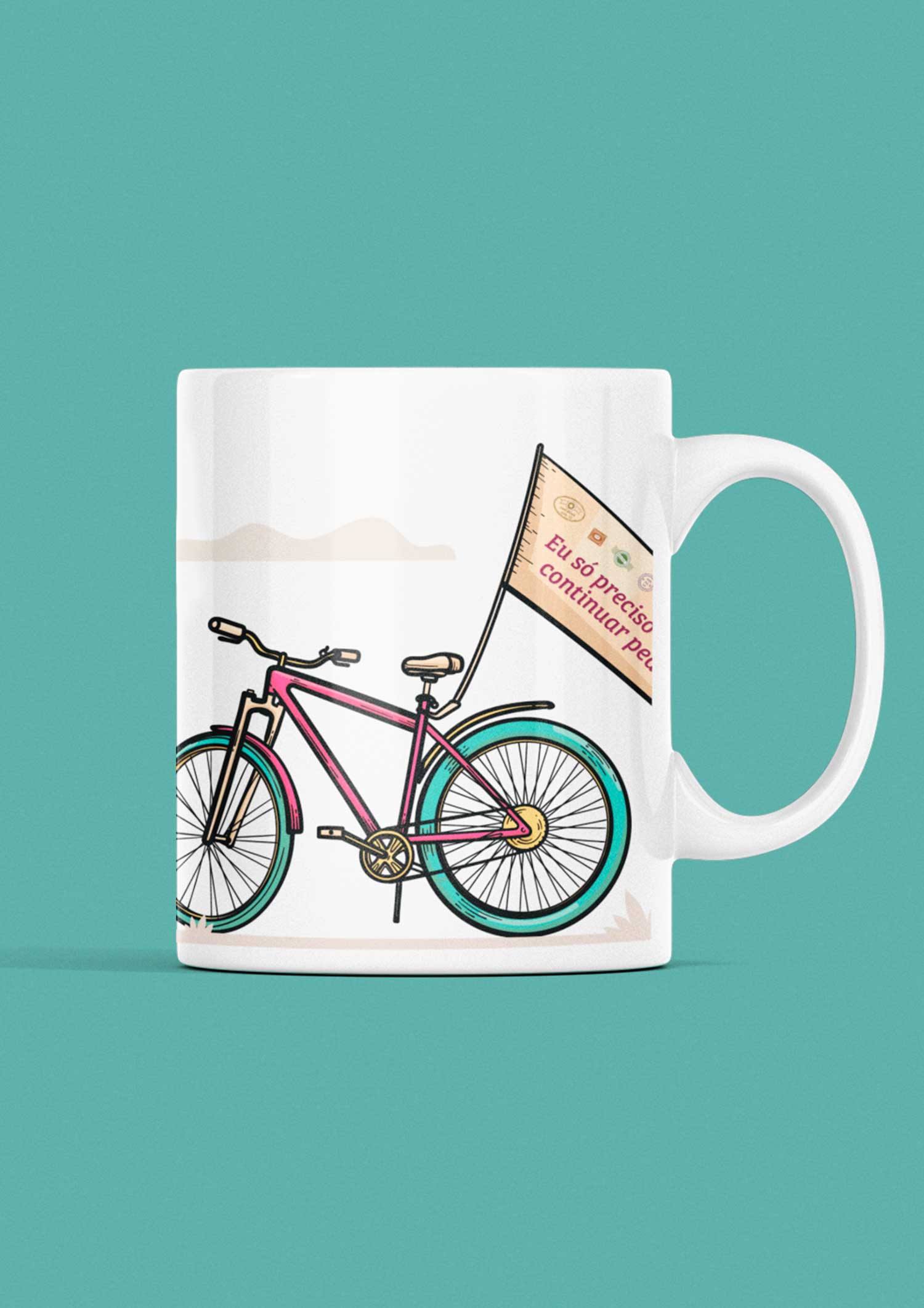 Caneca de cerâmica para os amantes ou simpatizantes de um bom pedal. Na bandeirinha da magrela está escrito: "Eu só preciso continuar pedalando!" E aí, curtiu? : )