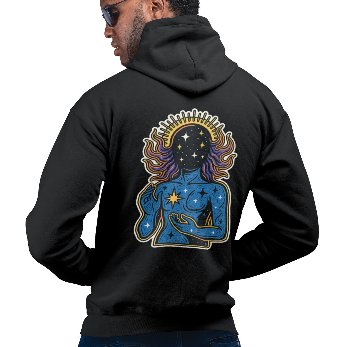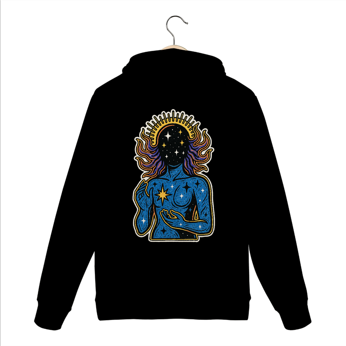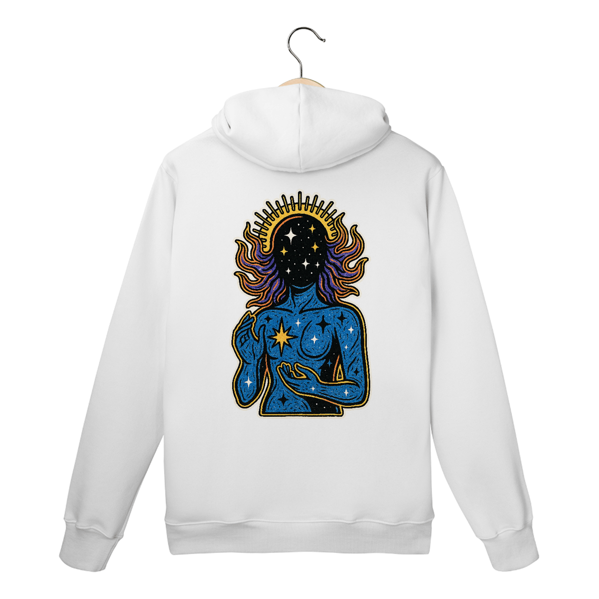 O moletom canguru “Alvorada” é um convite à conexão com o todo. Com traços marcantes e cores vibrantes, a estampa representa um ser em comunhão com o universo interior e exterior. Inspirada no amanhecer espiritual, essa peça carrega o símbolo do renascimento, da intuição e do poder que emana de dentro.