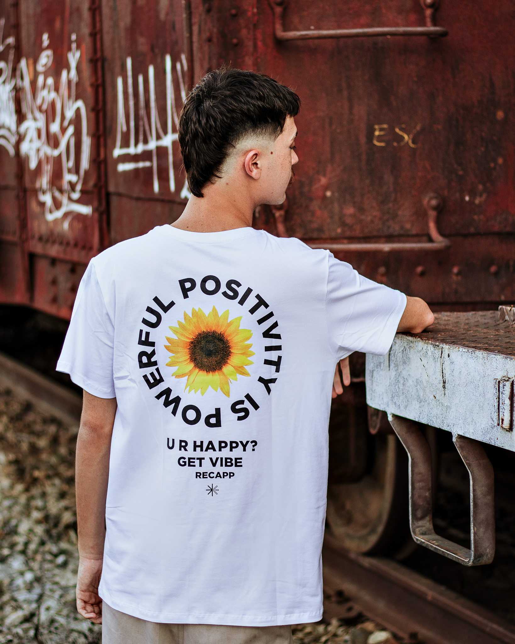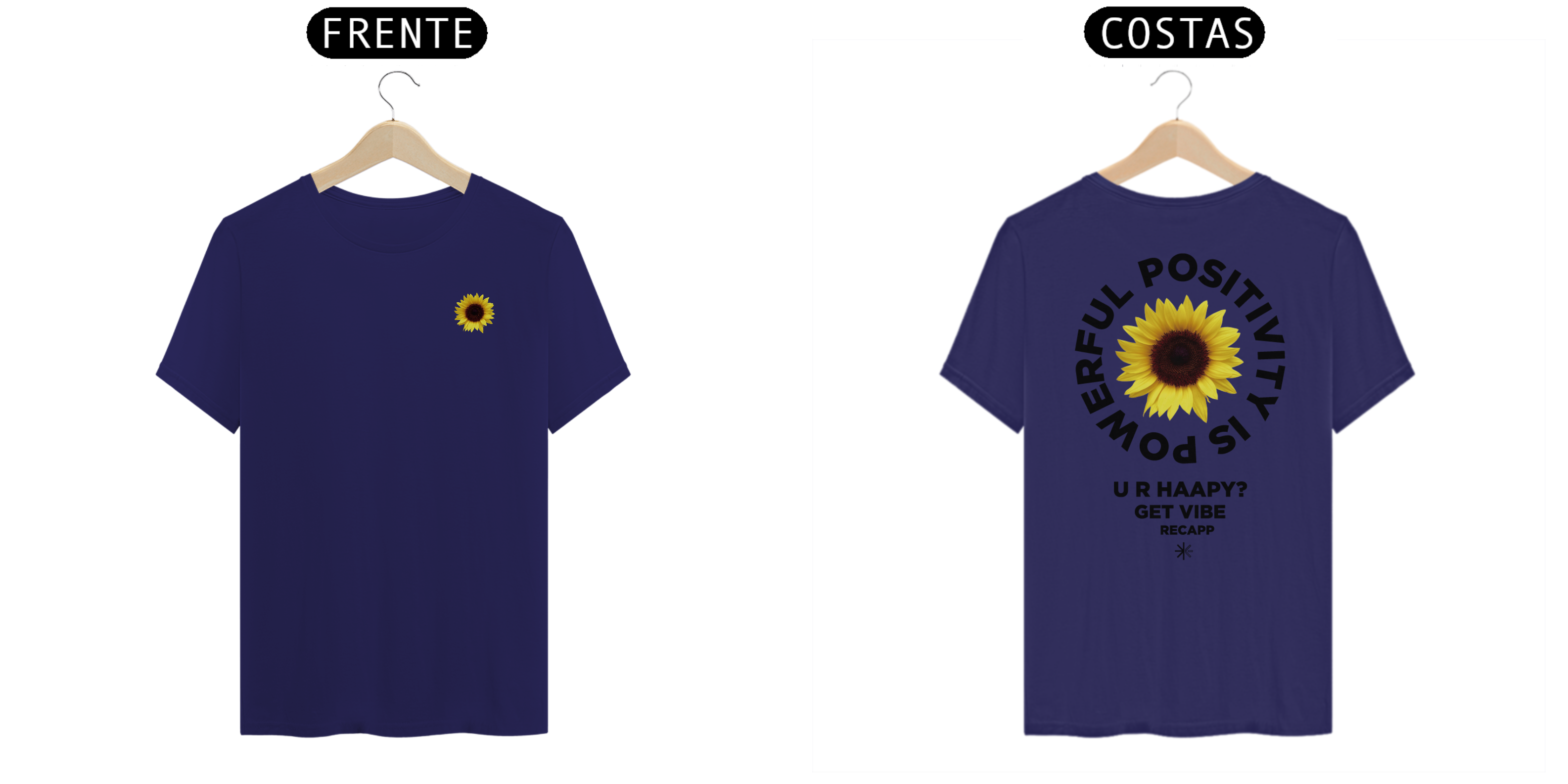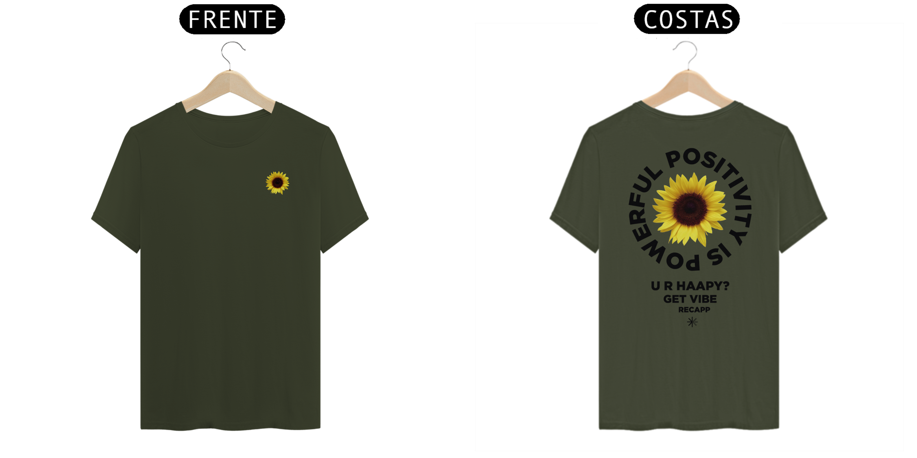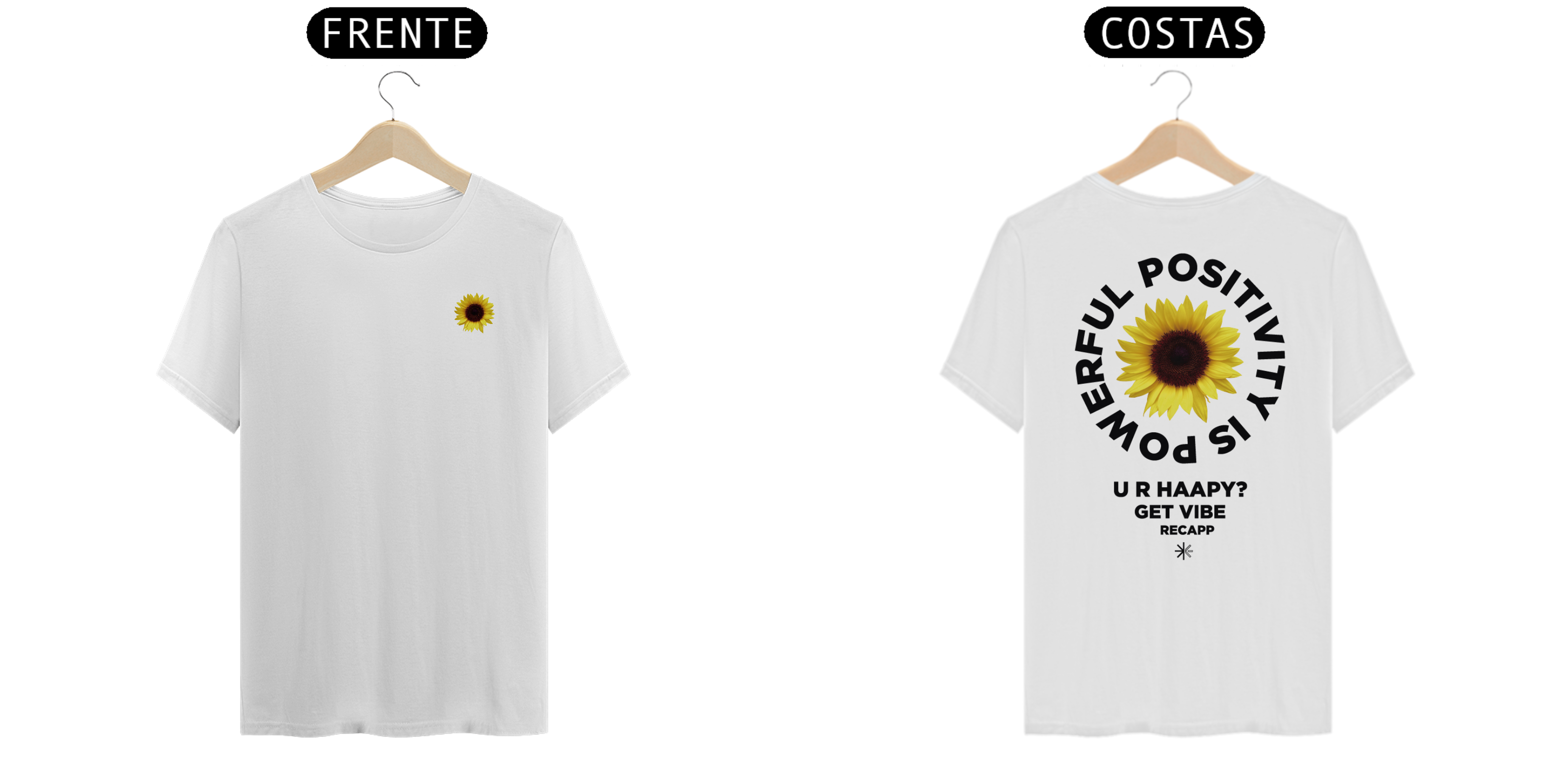 Recapp Get Vibes: Com um visual leve e vibrante, a camiseta Recapp Get Vibes traz o símbolo de felicidade e energia do girassol estampado na frente. Nas costas, a frase motivacional “Powerful Positivity is Power” e “U R Happy? Get Vibe” destaca a mensagem de otimismo. Confeccionada com materiais de qualidade, essa peça une estilo e conforto, sendo ideal para looks descontraídos e cheios de atitude.