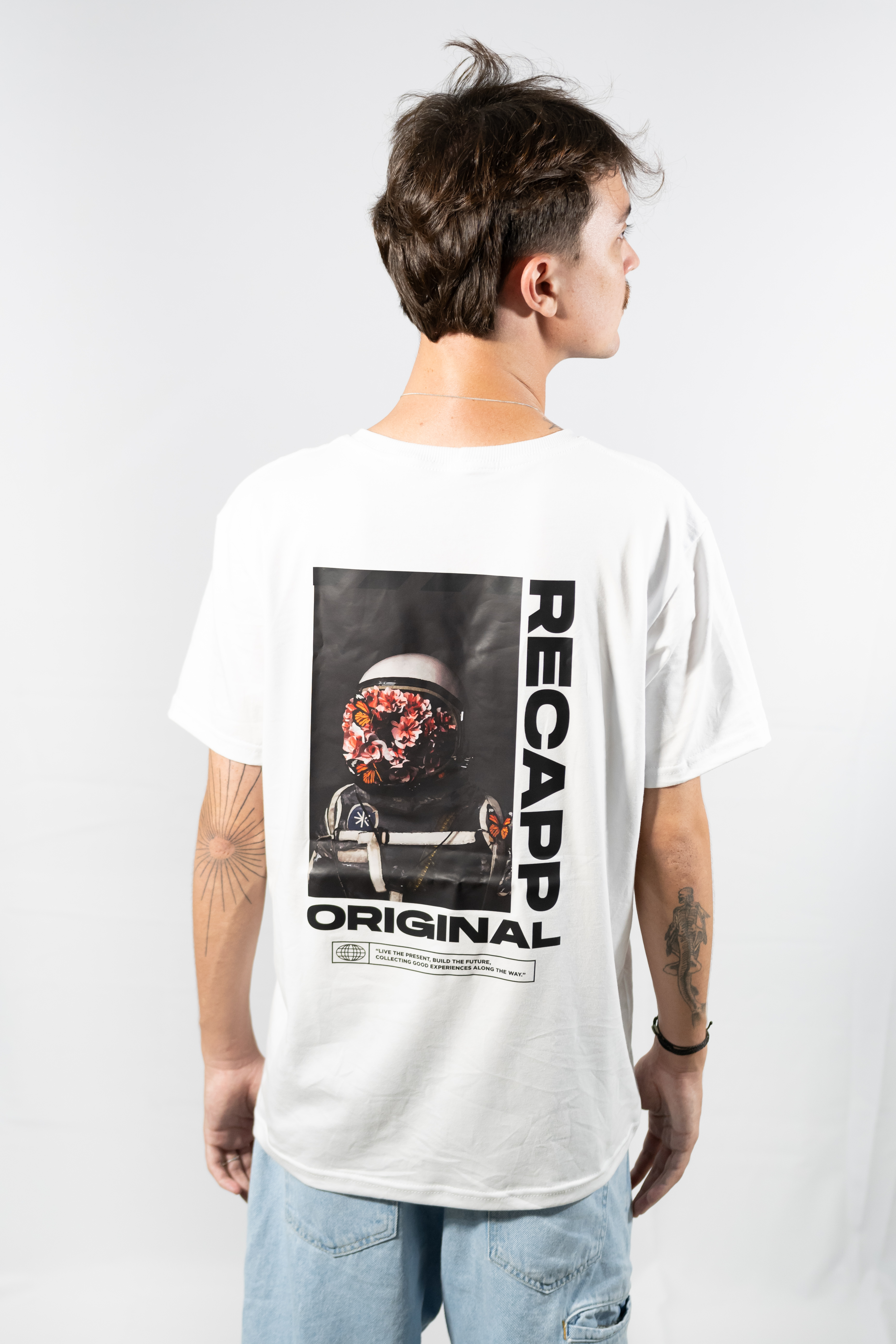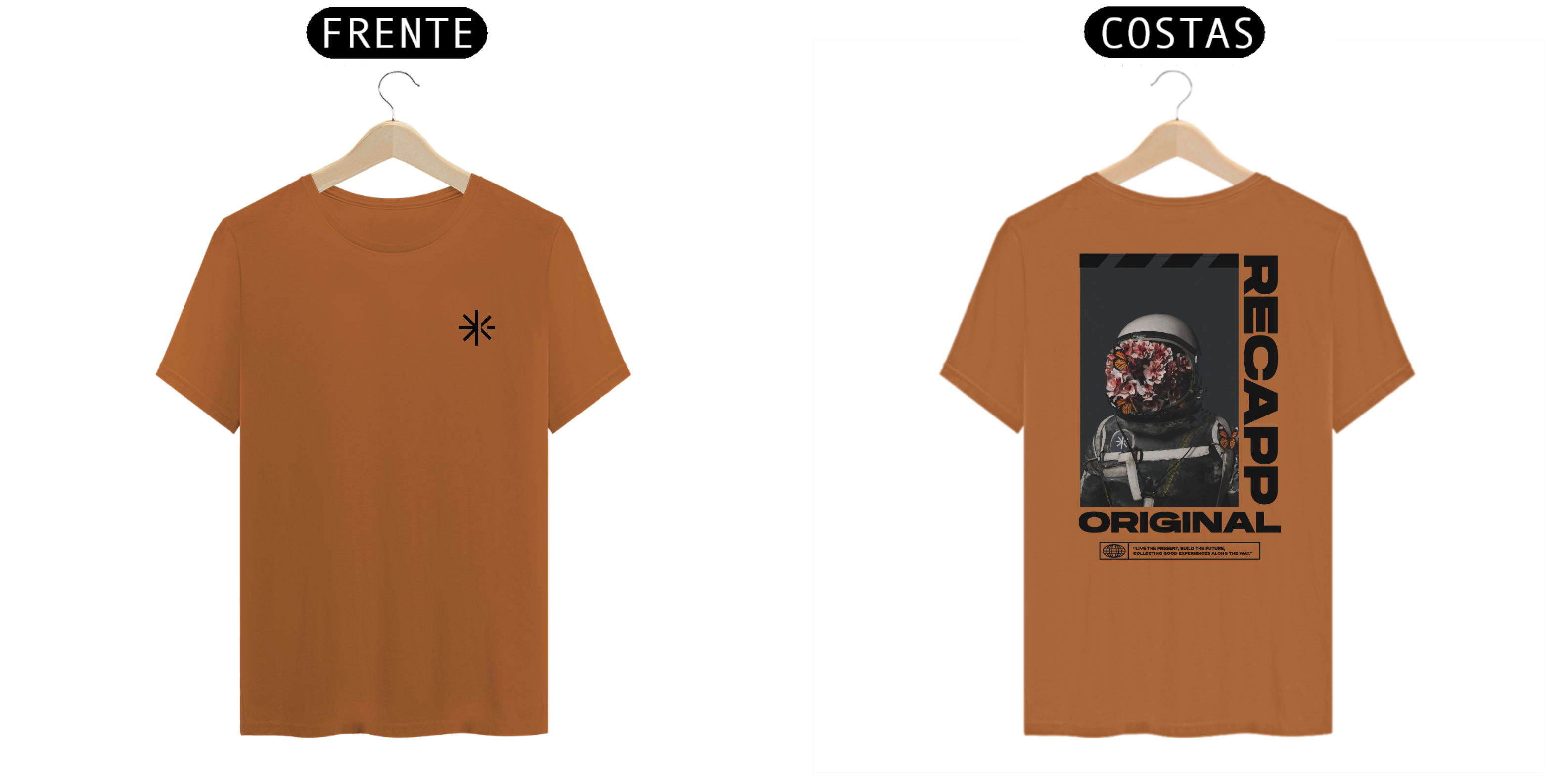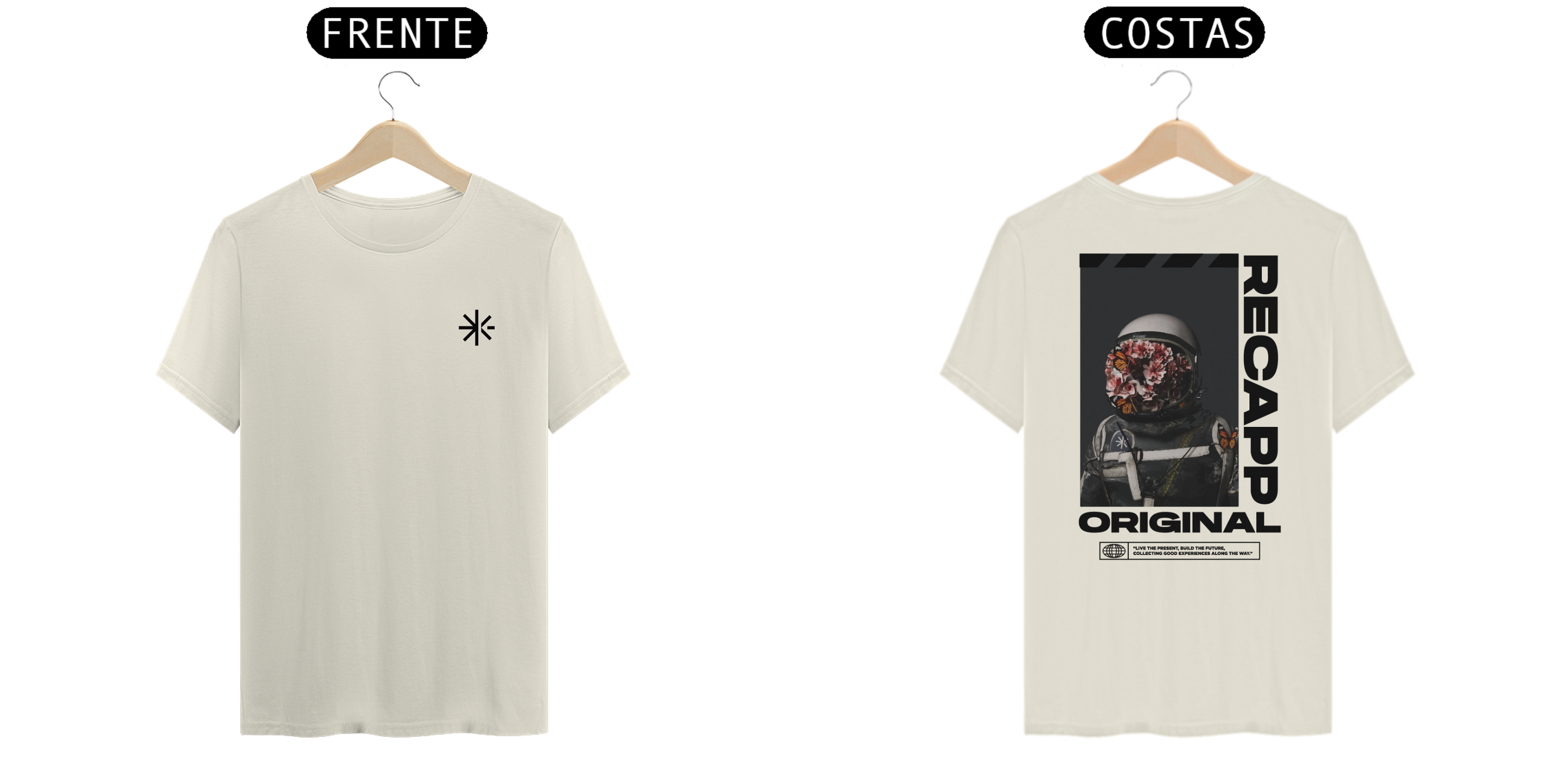 Recapp Space Flowers – Florescendo pelo universo: Somos viajantes no tempo, exploradores do desconhecido. A estampa “Space Flowers” representa essa jornada cósmica, onde o astronauta carrega no capacete não apenas tecnologia, mas também vida, evolução e experiências.