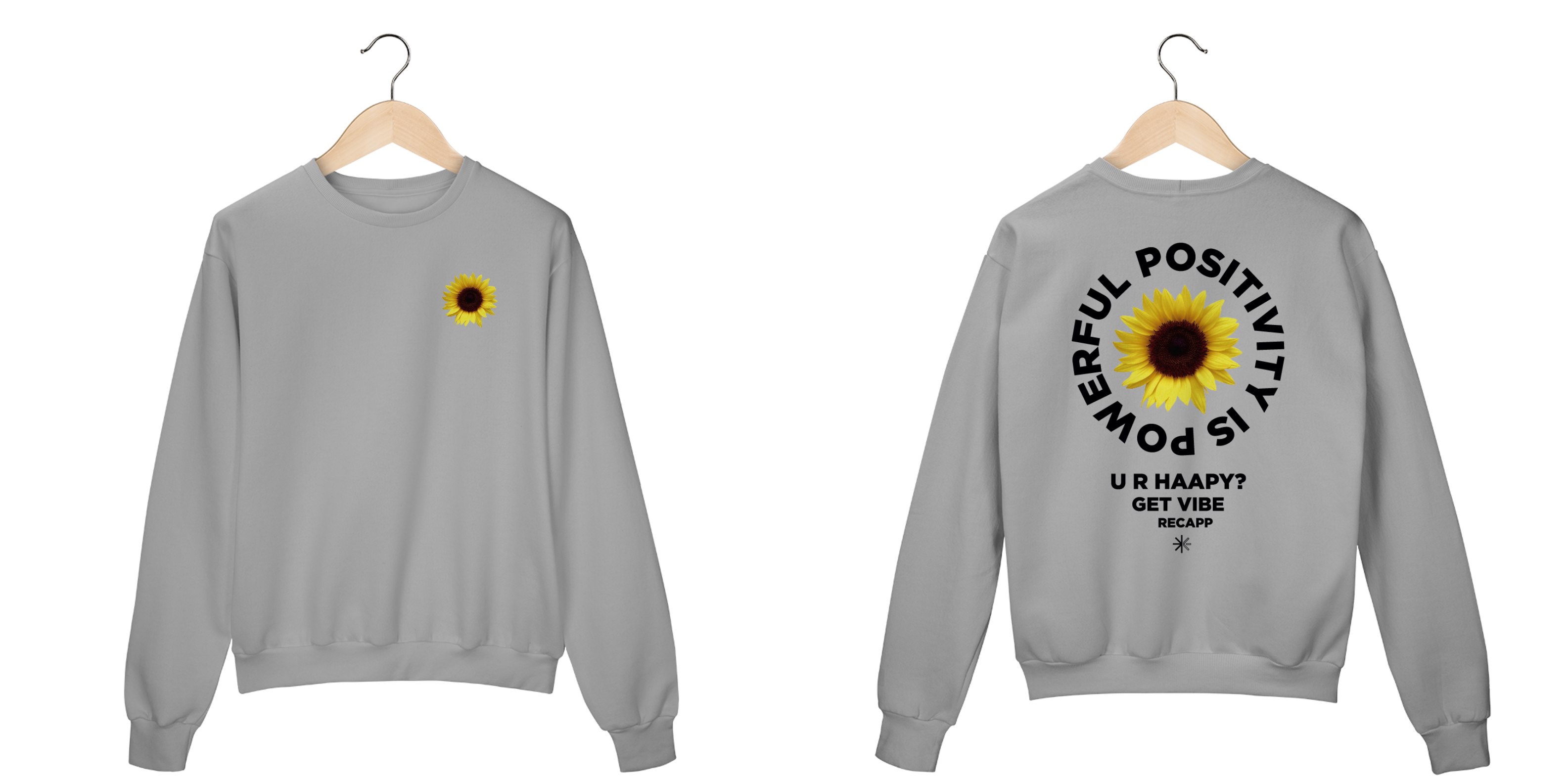 Recapp Get Vibes: Com um visual leve e vibrante, a Get Vibes traz o símbolo de felicidade e energia do girassol estampado na frente. Nas costas, a frase motivacional “Powerful Positivity is Power” e “U R Happy? Get Vibe” destaca a mensagem de otimismo. Confeccionada com materiais de qualidade, essa peça une estilo e conforto, sendo ideal para looks descontraídos e cheios de atitude.