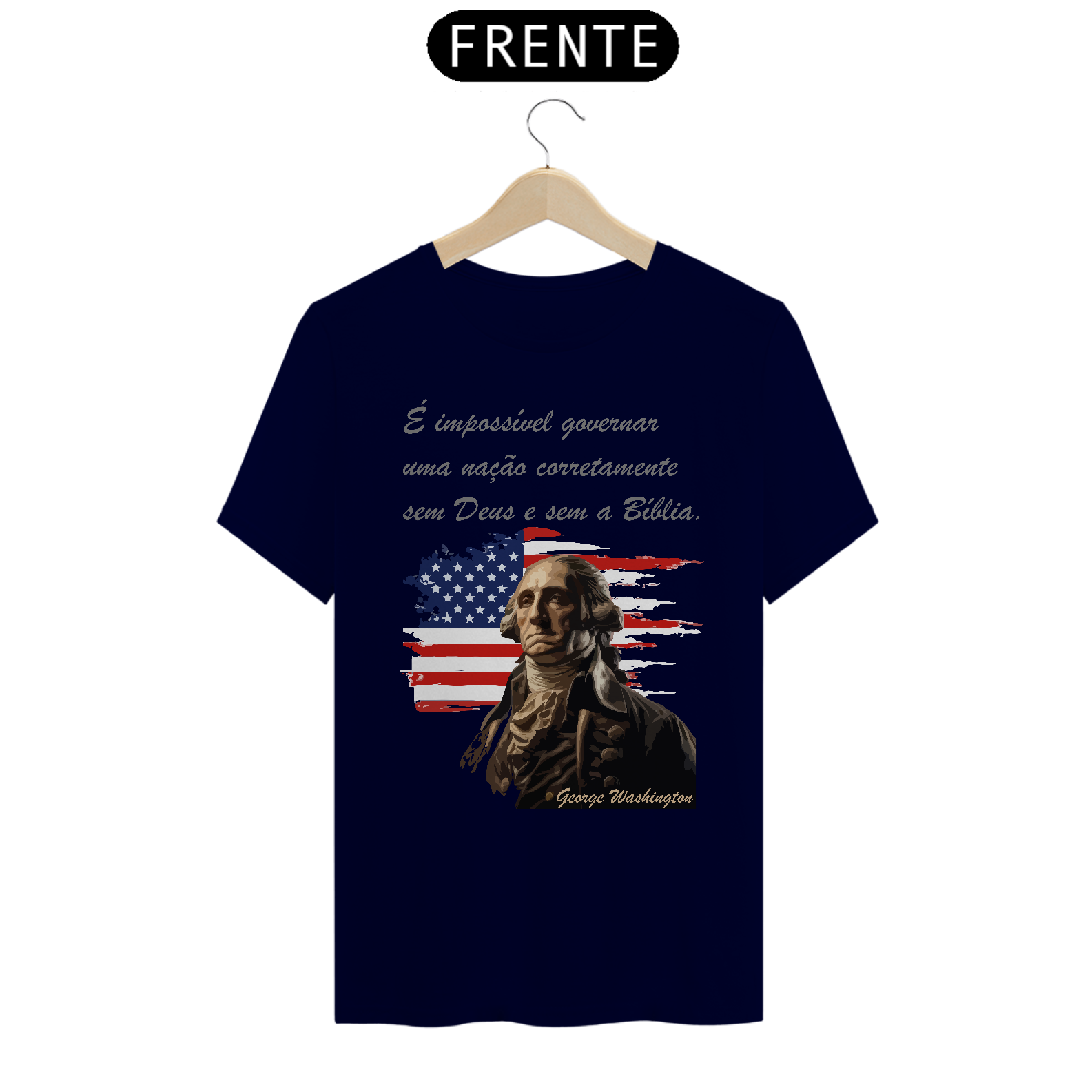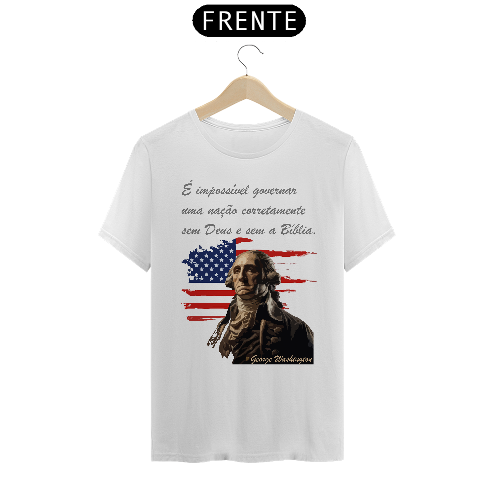 Esta estampa apresenta uma arte estilizada de George Washington, o primeiro presidente dos Estados Unidos. Ao fundo, há uma bandeira americana que simboliza os valores e a história dos Estados Unidos. A frase "É impossível governar uma nação corretamente sem Deus e sem a Bíblia." reforçando a mensagem de fé e princípios cristãos como base para a liderança e governança. A estampa combina patriotismo e espiritualidade, ideal para aqueles que desejam expressar valores cristãos e inspiração histórica em suas roupas.
