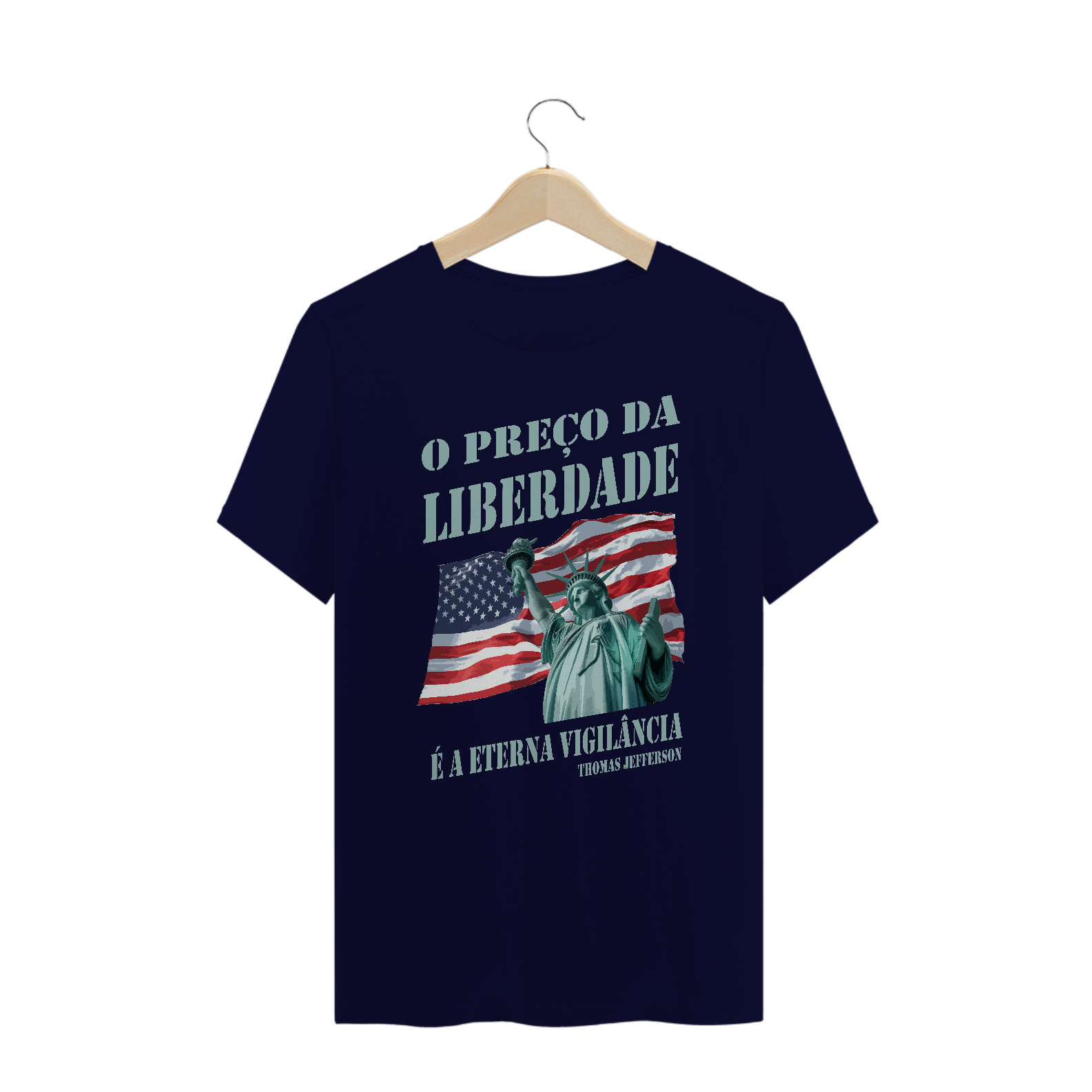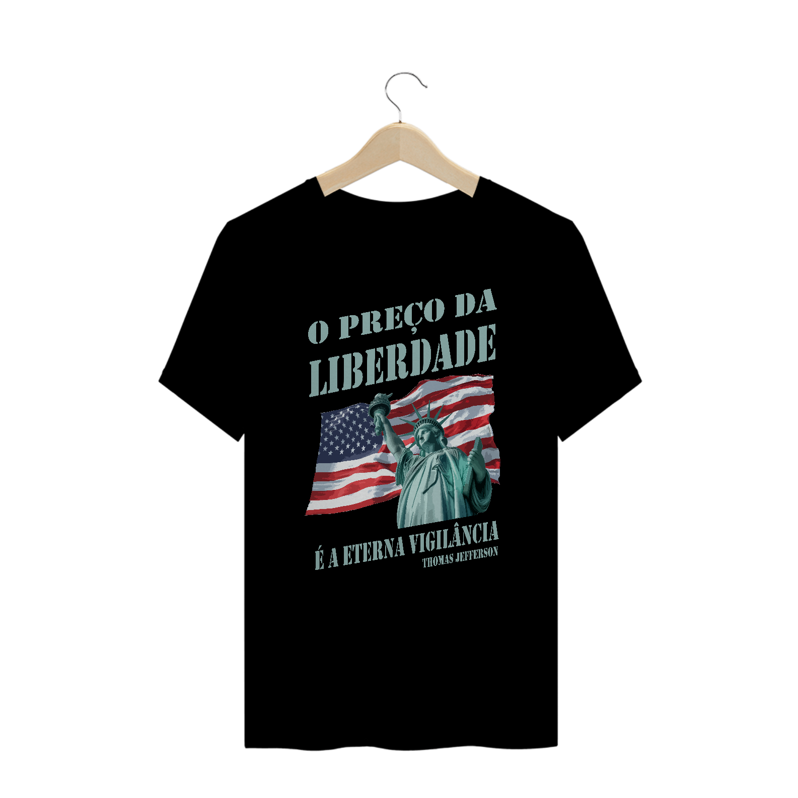 Esta estampa combina a frase "O preço da liberdade é a eterna vigilância", atribuída a Thomas Jefferson, que transmite uma mensagem de que a liberdade exige cuidado constante e responsabilidade. Combinada com dois símbolos icônicos: a Estátua da Liberdade em destaque e a bandeira americana ao fundo, representando os ideais de independência e vigilância. Perfeita para quem valoriza os princípios de liberdade, democracia e compromisso, esta peça une história e patriotismo com um visual impactante.