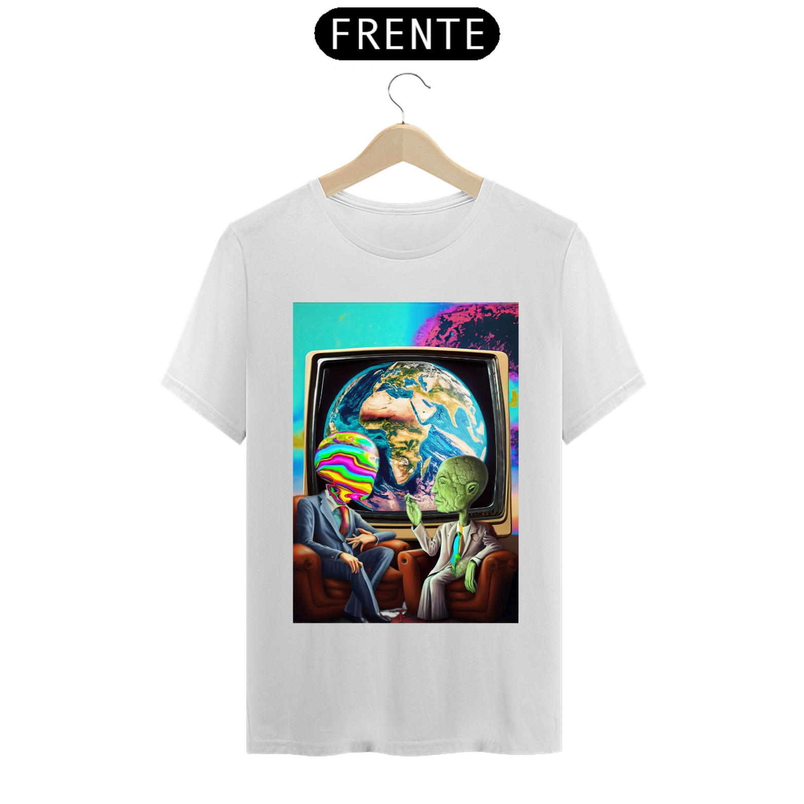 Nessa estampa intrigante, dois alienígenas fascinantes se encontram para uma conversa intergaláctica, enquanto a Terra é exibida em uma televisão vintage ao fundo. Essa combinação única captura a curiosidade e o fascínio pela possibilidade de vida além do nosso planeta.