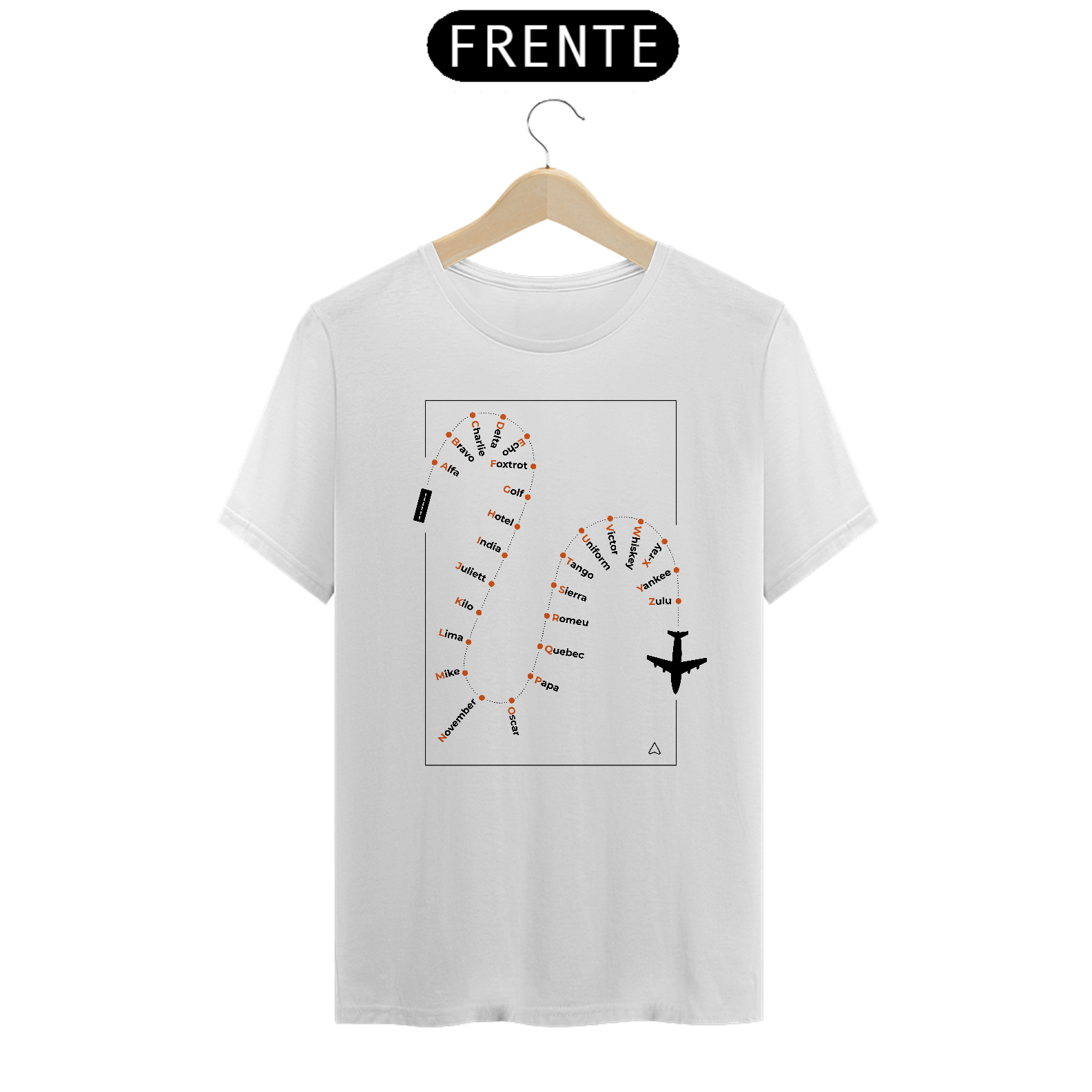 Camiseta em algodão Pima com o alfabeto fonético aeronáutico seguindo a MCA-100-16