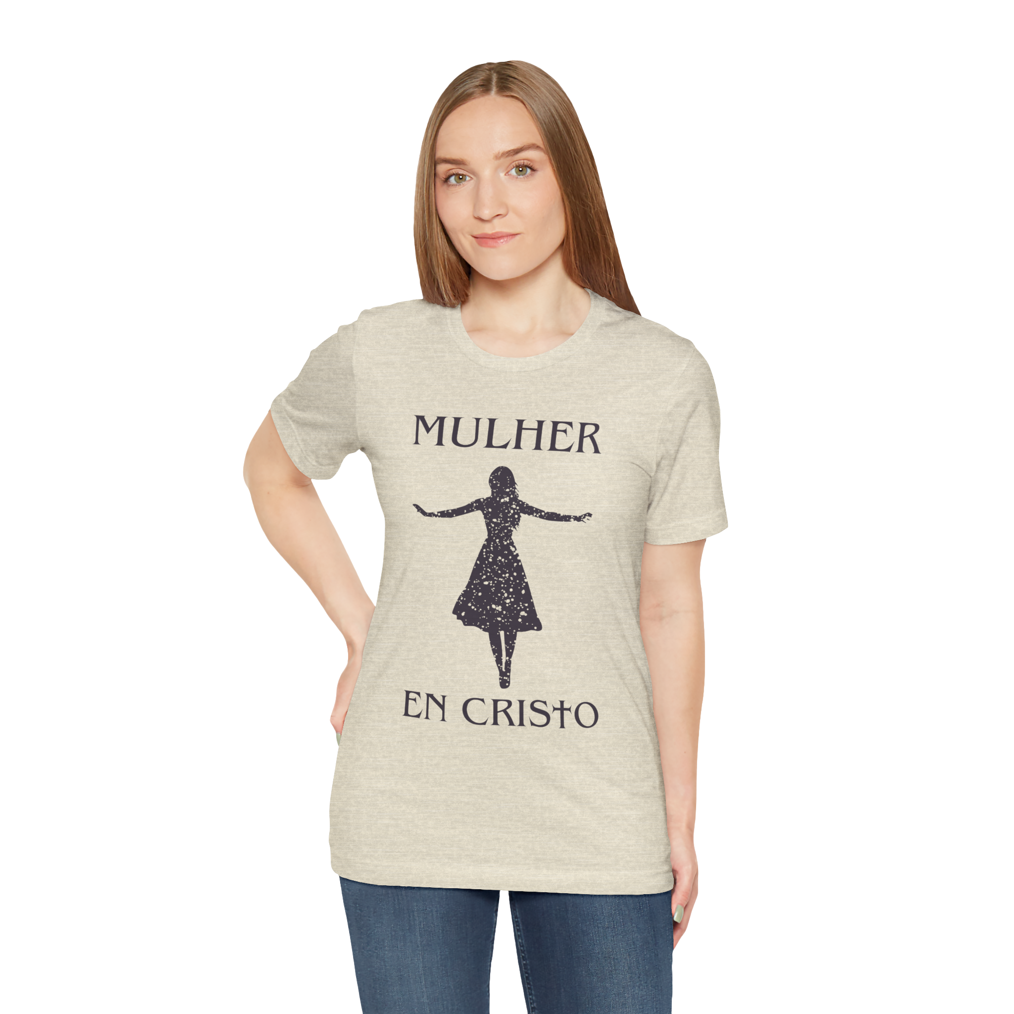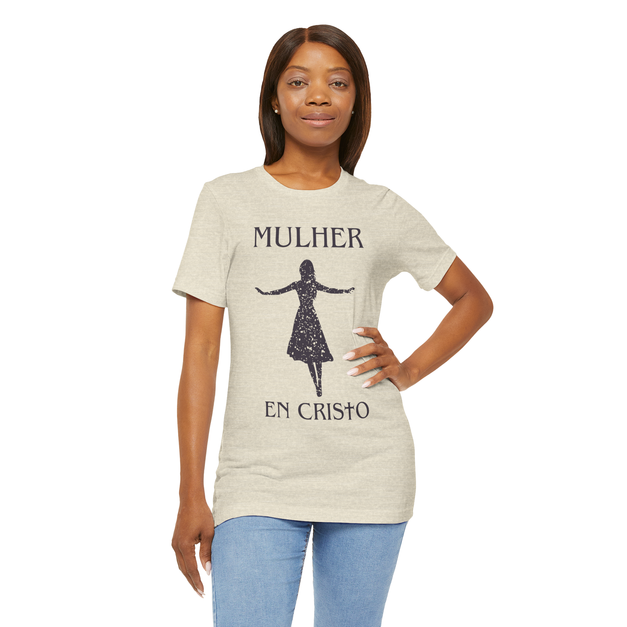 Uma mulher que anda com Cristo é forte, livre e cheia de propósito. Esta camiseta celebra a identidade da mulher cristã com uma silhueta marcante e a frase poderosa “Mulher em Cristo”. Ideal para quem quer expressar sua fé com leveza e estilo.