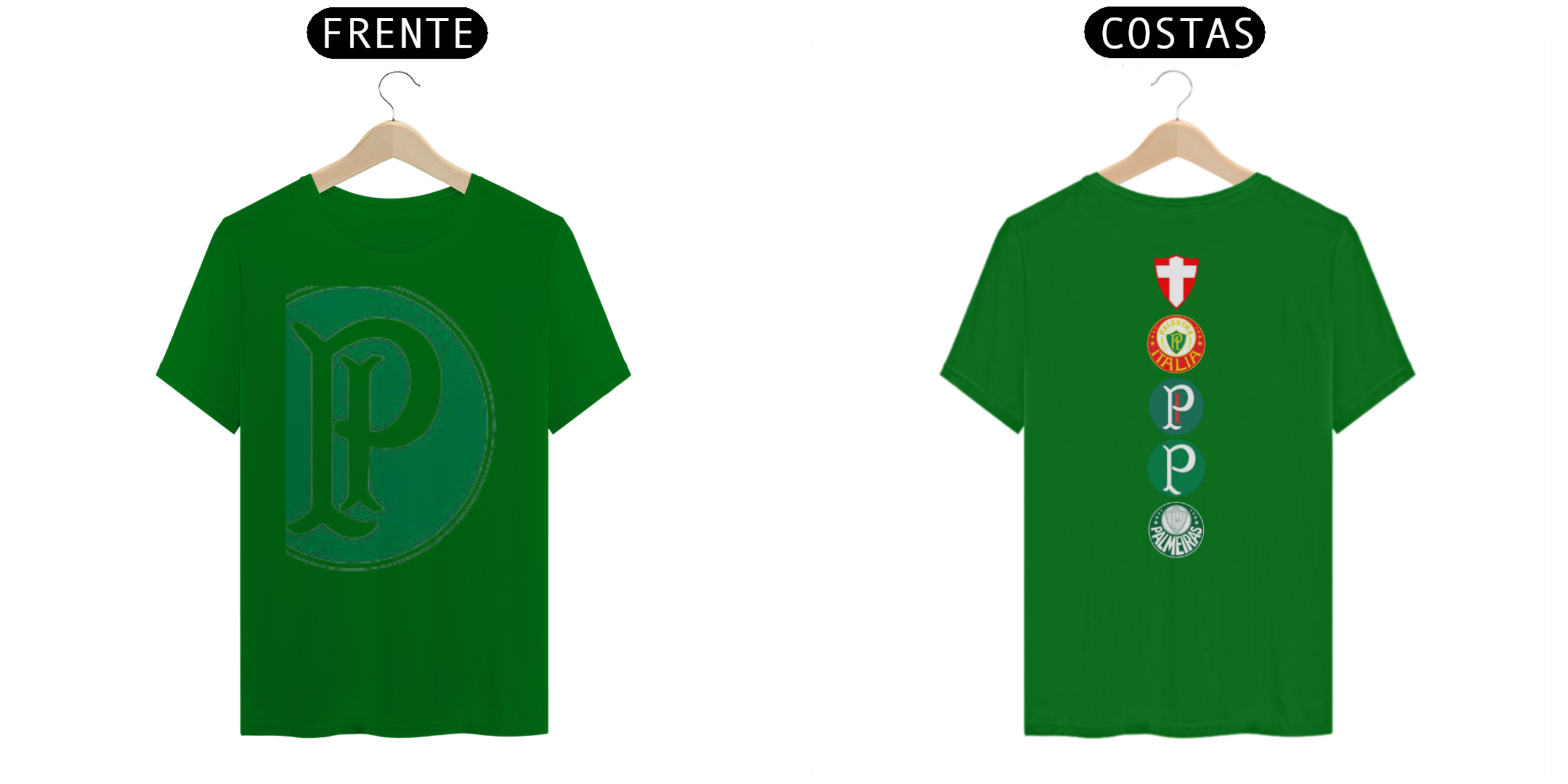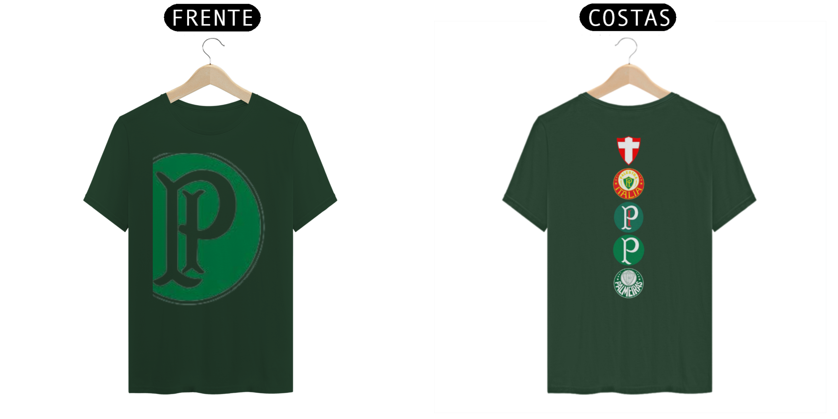 • Frente: Apresenta um grande escudo do Palmeiras, centralizado e em destaque, simbolizando a força e a tradição do clube.