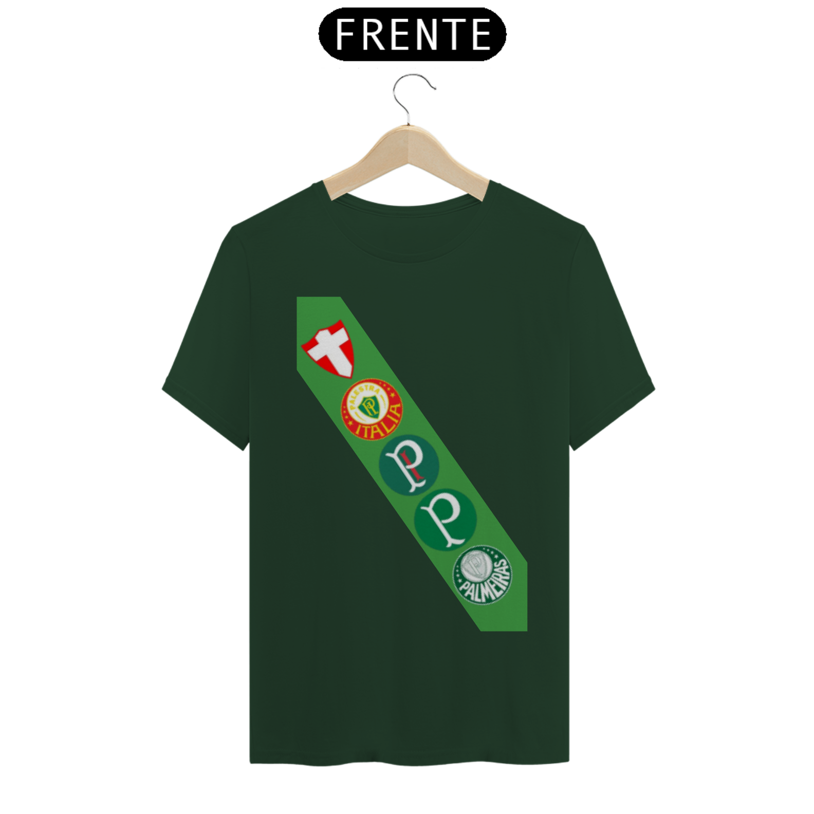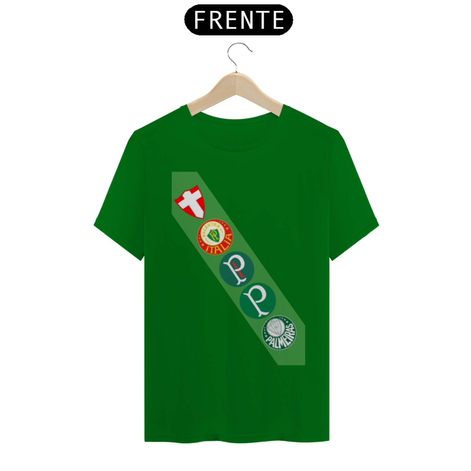 • Frente: Apresenta uma série de escudos históricos do Palmeiras dispostos de forma estilizada. Os escudos representam diferentes épocas do clube, celebrando sua rica história e conquistas.