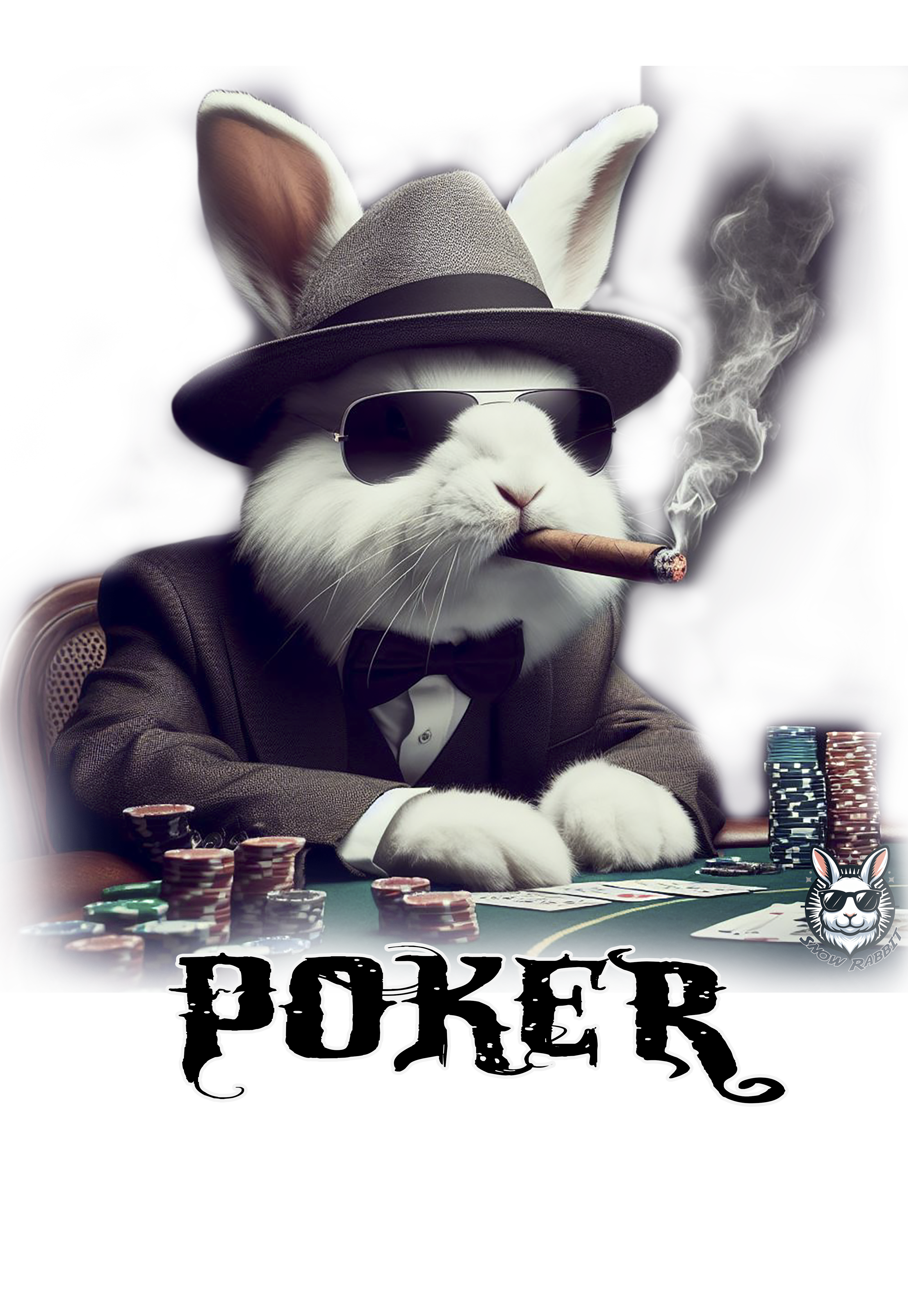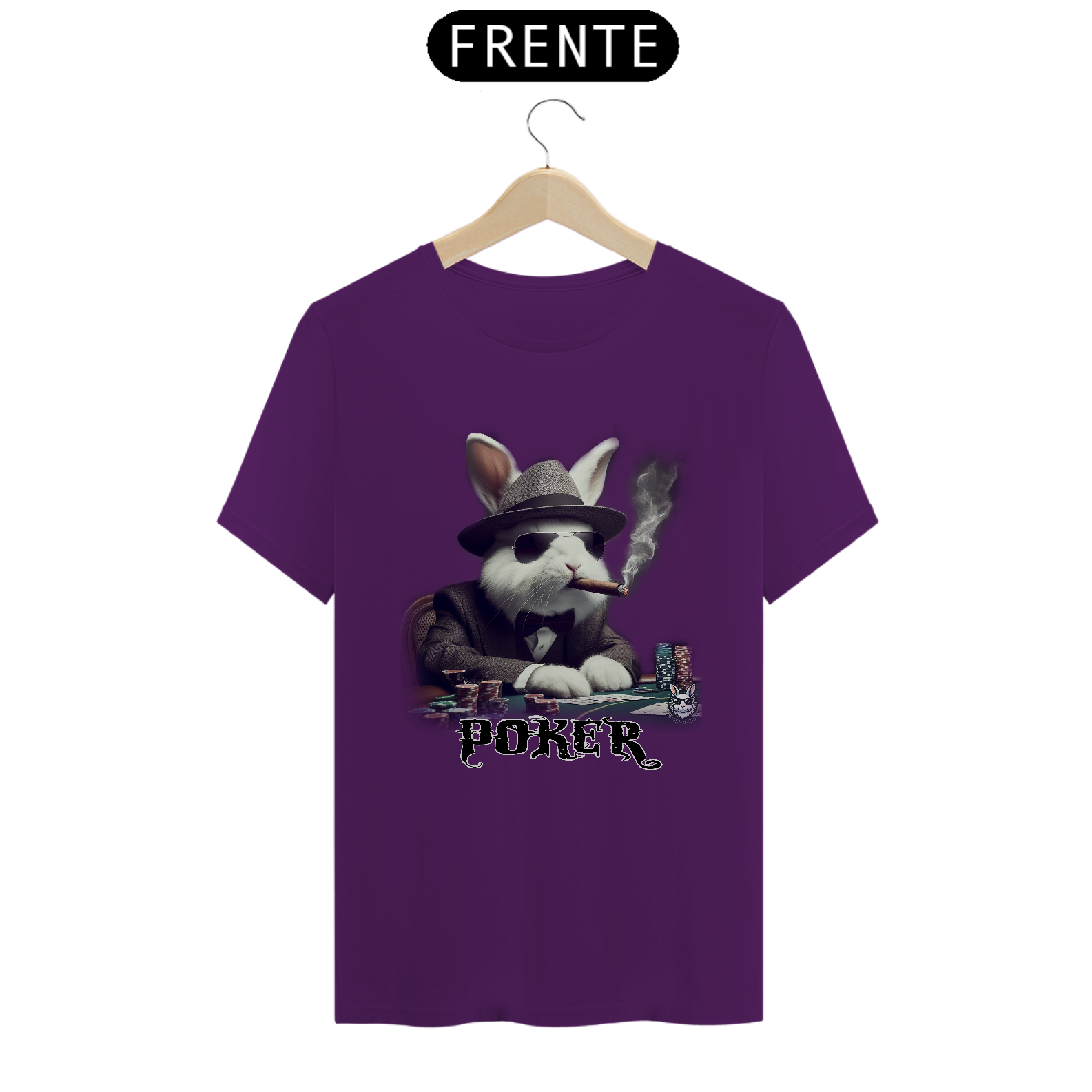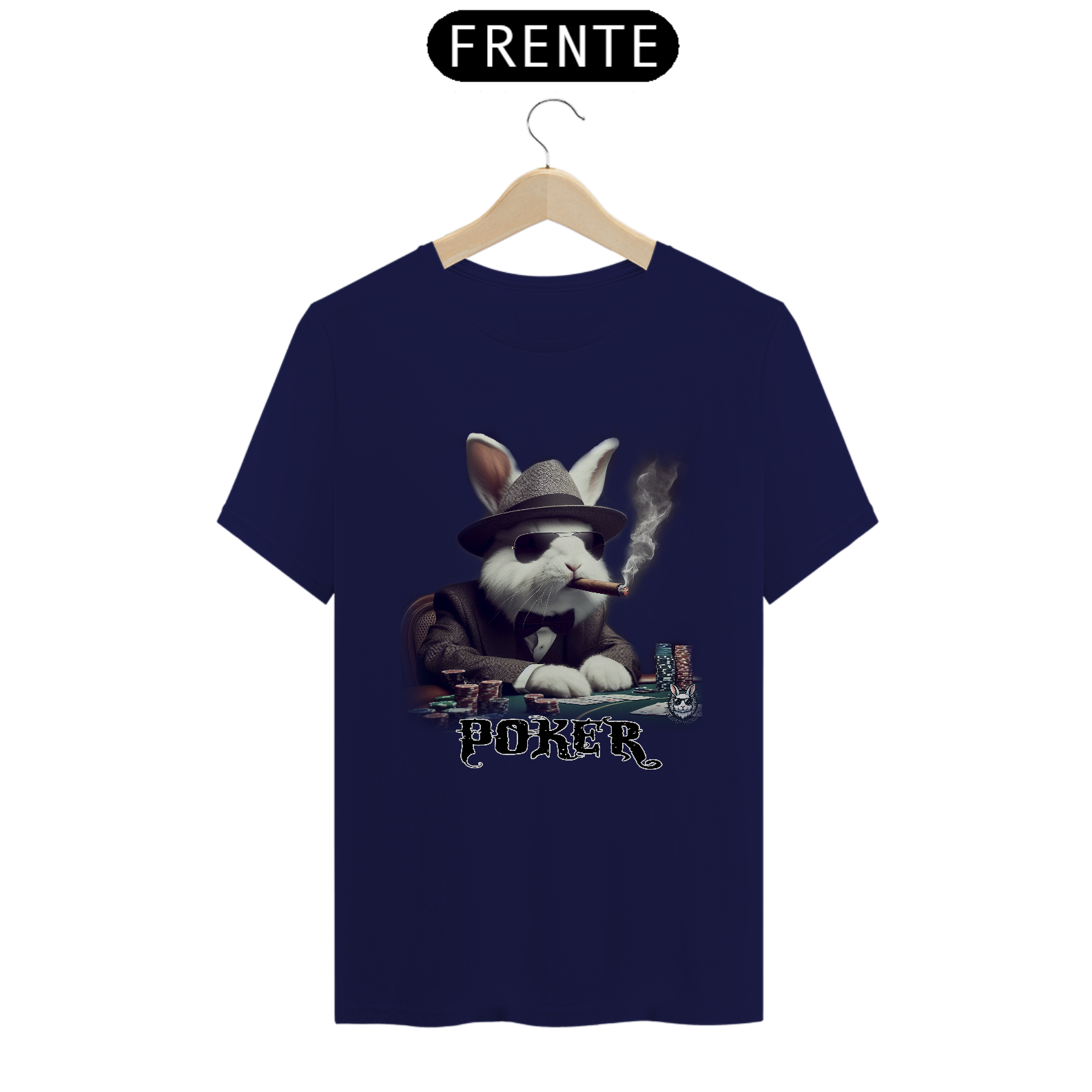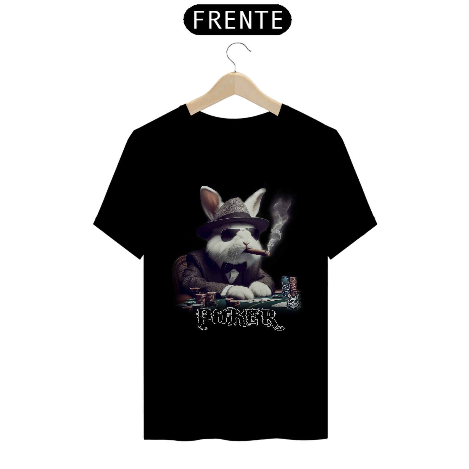Jogue com estilo! Camiseta exclusiva com estampa Snow Rabbit jogador de poker. Mostre sua paixão pelo jogo com elegância. Garanta já a sua!