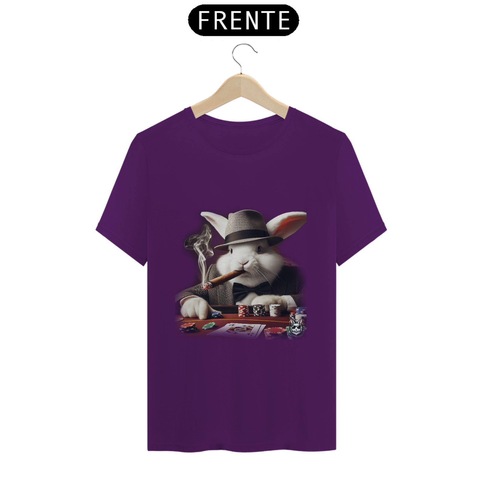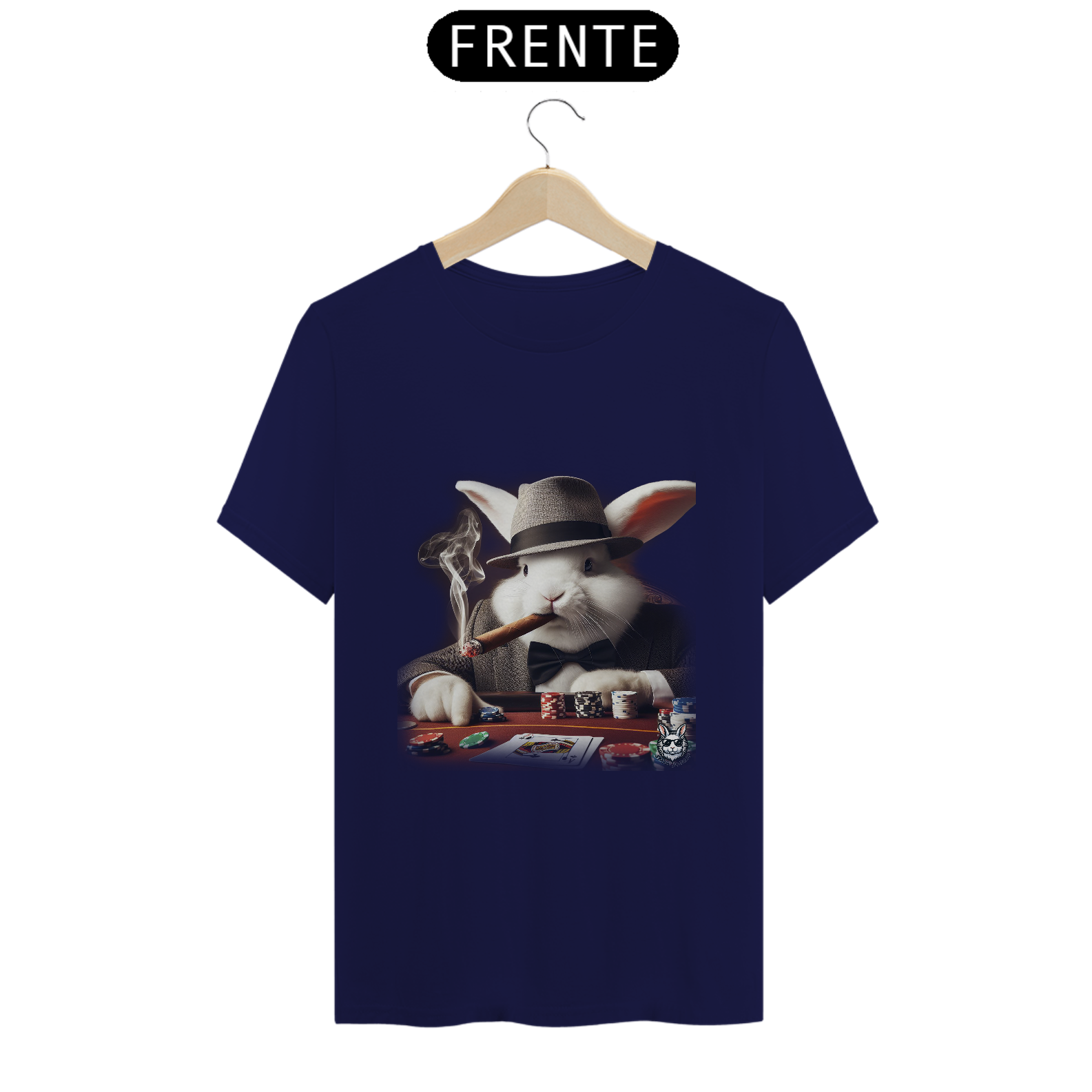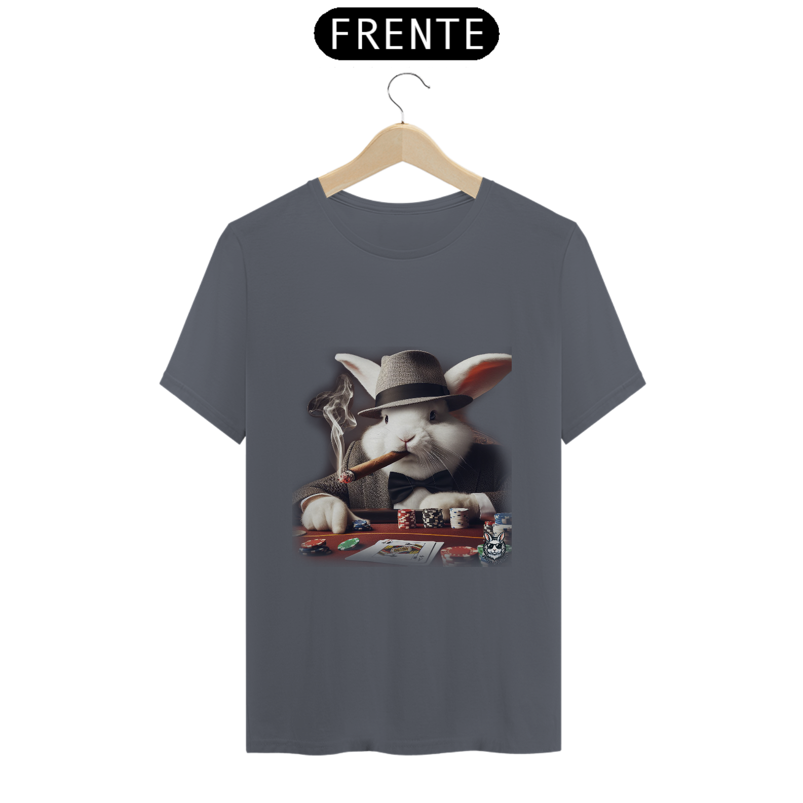 Jogue com estilo! Camiseta exclusiva com estampa Snow Rabbit jogador de poker. Mostre sua paixão pelo jogo com elegância. Garanta já a sua!