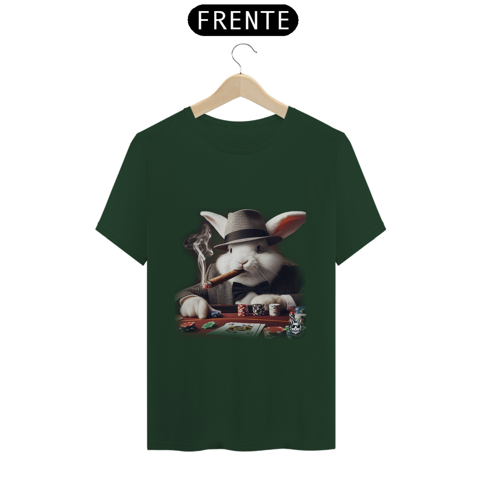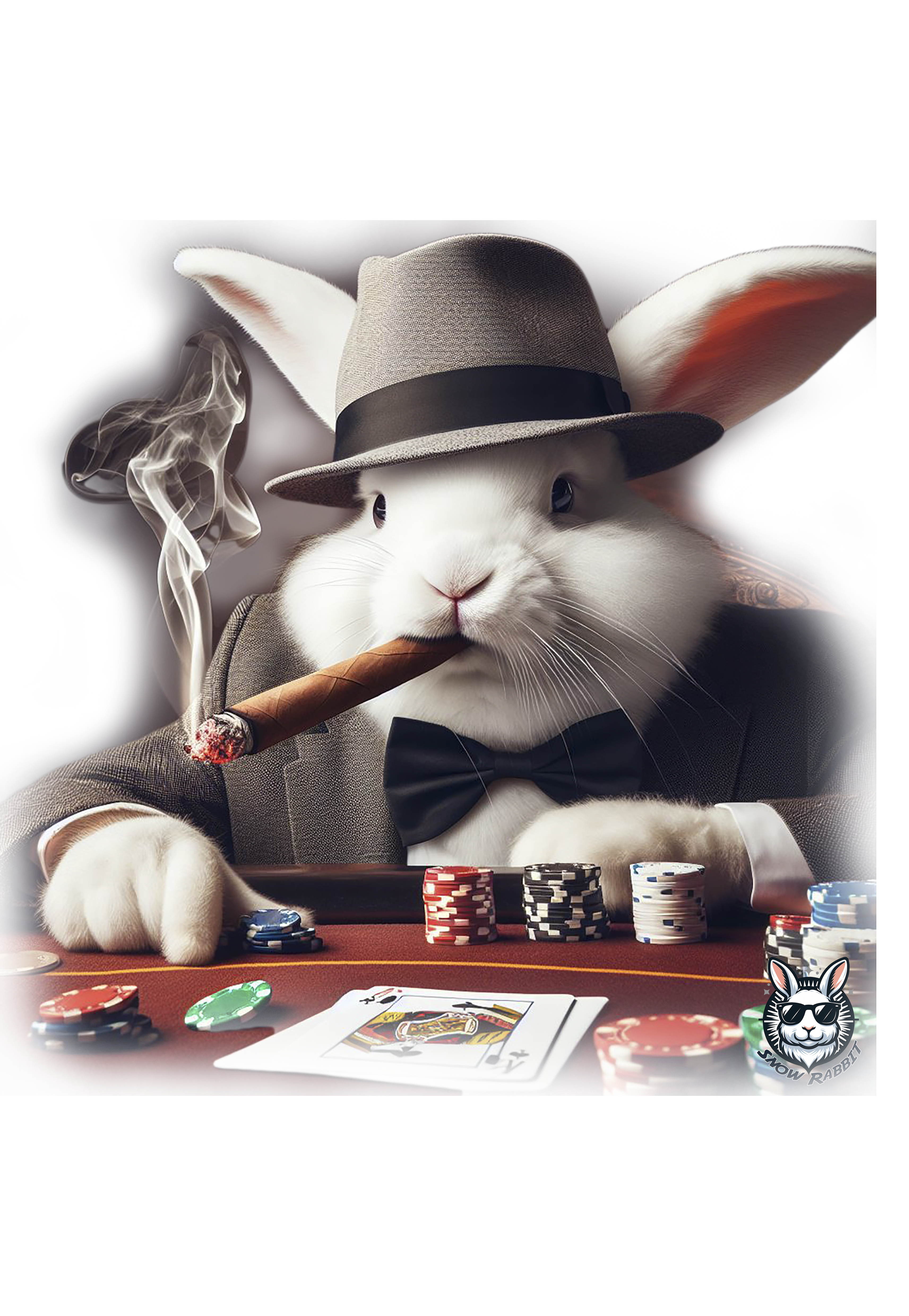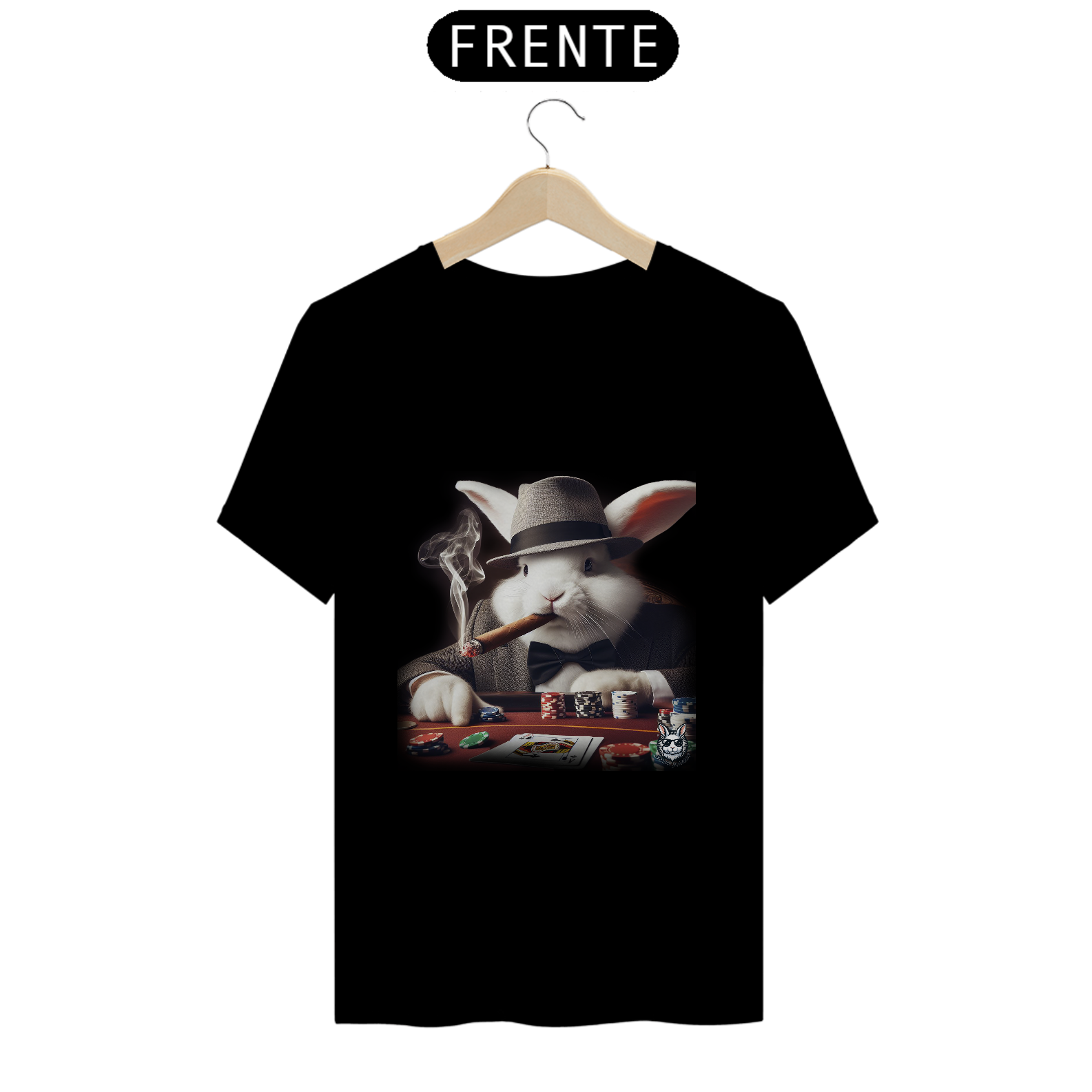 Jogue com estilo! Camiseta exclusiva com estampa Snow Rabbit jogador de poker. Mostre sua paixão pelo jogo com elegância. Garanta já a sua!