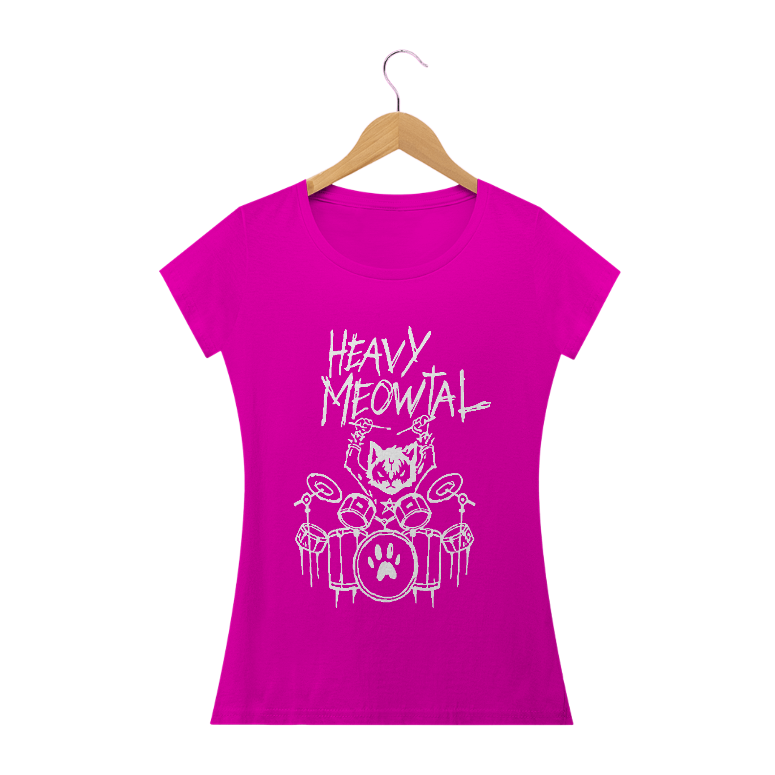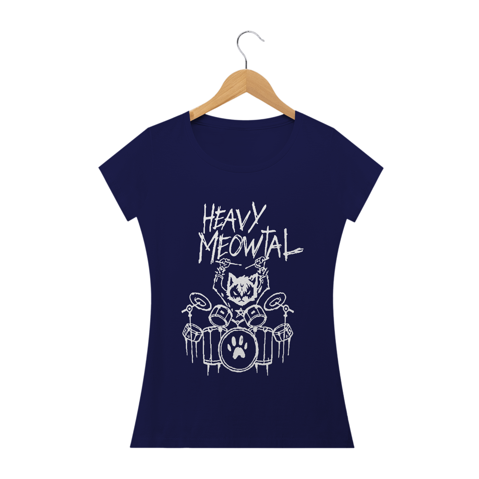 Uma camiseta com a estampa "Heavy Meowtal" é uma sátira divertida ao gênero musical "heavy metal", substituindo a palavra "metal" por "meowtal", que é uma brincadeira com o som que os gatos fazem, o "meow". Nesta estampa, elementos do heavy metal, como letras góticas, detalhes intricados e imagens de gatos poderosos, são combinados de forma criativa.